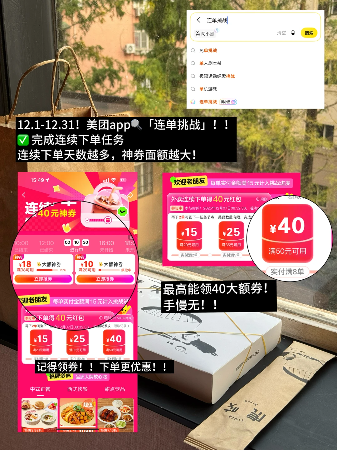 💪🏻打工人的午餐难题终于被我破解了! 吃一周不重样的精致午饭💰薅了美团40r神券! 👍🏻这波操作我能吹一年!!! 😋顺便给大家分享一下吃到的好吃外卖!! 攻略给大家整理在下面了!⬇️ . ⏰12.1-12.31期间,美团app🔍「连单挑战」!! 完成连续下单任务!!记得先领券再下单!! 连续下单天数越多🤩神券面额越大!最高能领40!!! 上班本来就够累了,用最少的钱吃最舒服的饭,才是打工人的续命法则~✅ 别再原价点外卖啦!赶紧去搜「连单挑战」,40元神券手慢无! .