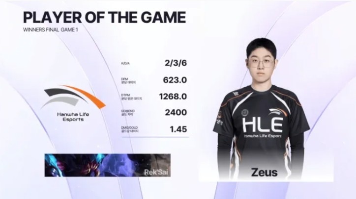 Zeus雷克塞砍下2/3/6的战绩,拿下HLE对阵DK首局MVP