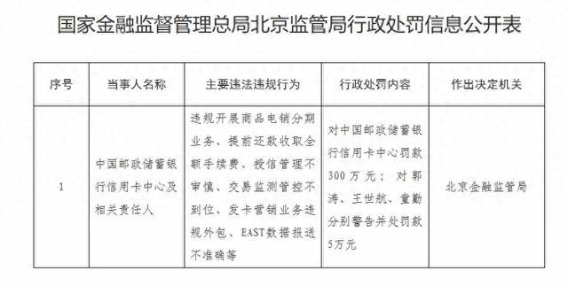 行政处罚决定书显示,中国邮政储蓄银行信用卡中心存在违规开展商品电销分期业务、提前还款收取全额手续费、授信管理不审慎、交易监测管控不到位、发卡营销业务违规外包以及EAST数据报送不准确等六大问题。北京金融监管局对中国邮政储蓄银行信用卡中心处以罚款300万元。同时,相关责任人郭涛、王世航、童勤分别被处以警告并罚款5万元。(信网记者)