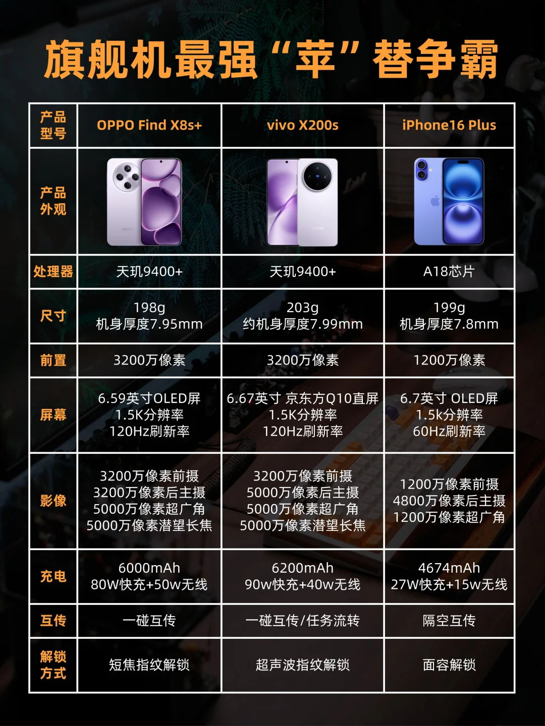 宝子们~近期三台 “果味” 新机热度拉满!iPhone 16 Plus、vivo X200s、OPPO Find X8s+ 的深度测评来啦!从屏幕到续航,从影像到生态,哪款更值得冲?看完这篇秒懂~