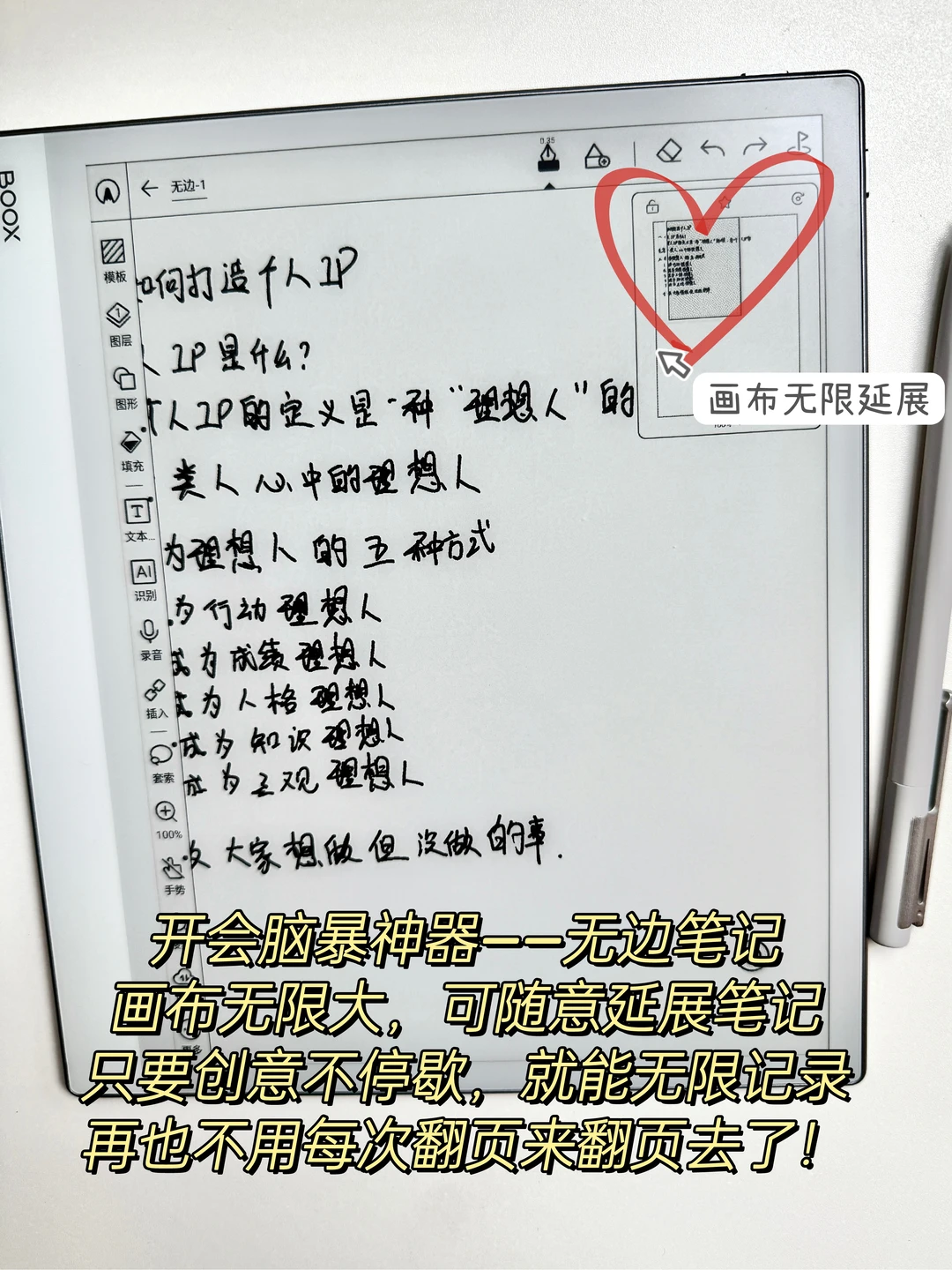 现在有了无边笔记,画布无限延伸,只要你有灵感创意,想到什么就可以往画布上写,放大缩小随意拖,画图、逻辑分析、全部事项一页记录一页全搞定!😎
