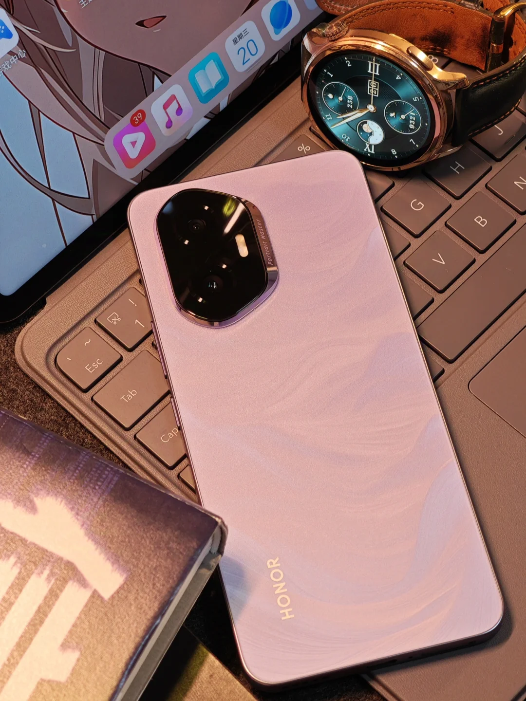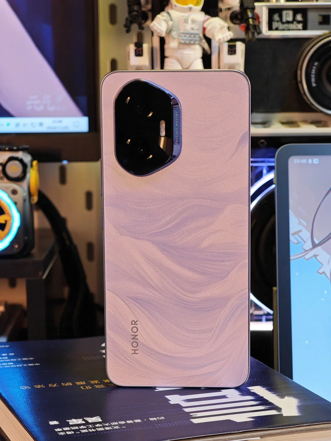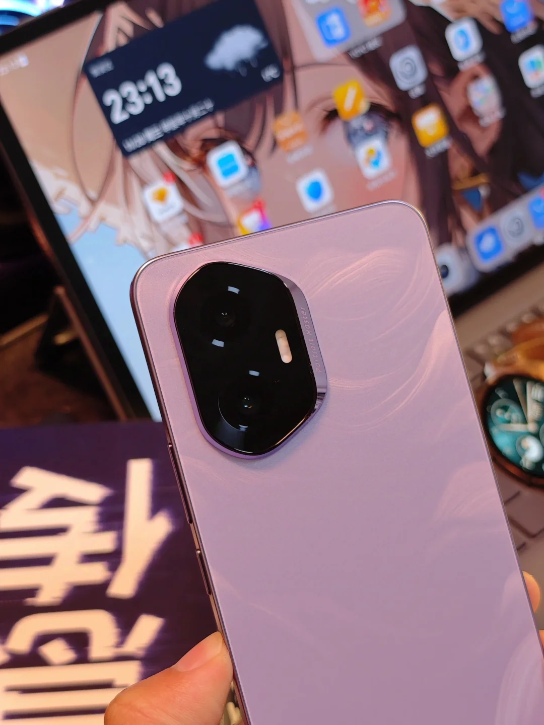 这才是荣耀300真机的样子,这是庐烟紫配色,纹理如烟如雾飘散起舞,在不同光线下折射出不同颜色,日光下是紫色,暖光下有点粉,甚是好看。手机特别轻薄,我掂量着可能是同价位最薄直屏。 后置摄像头模组是旷野舷窗设计,蕴意人生是旷野,风景在路上。所谓日照香炉生紫烟,遥看瀑布挂前川,我觉得设计师的宏愿是愿大家的旅途的美好瞬间,都能收纳舷窗之中,你说呢?