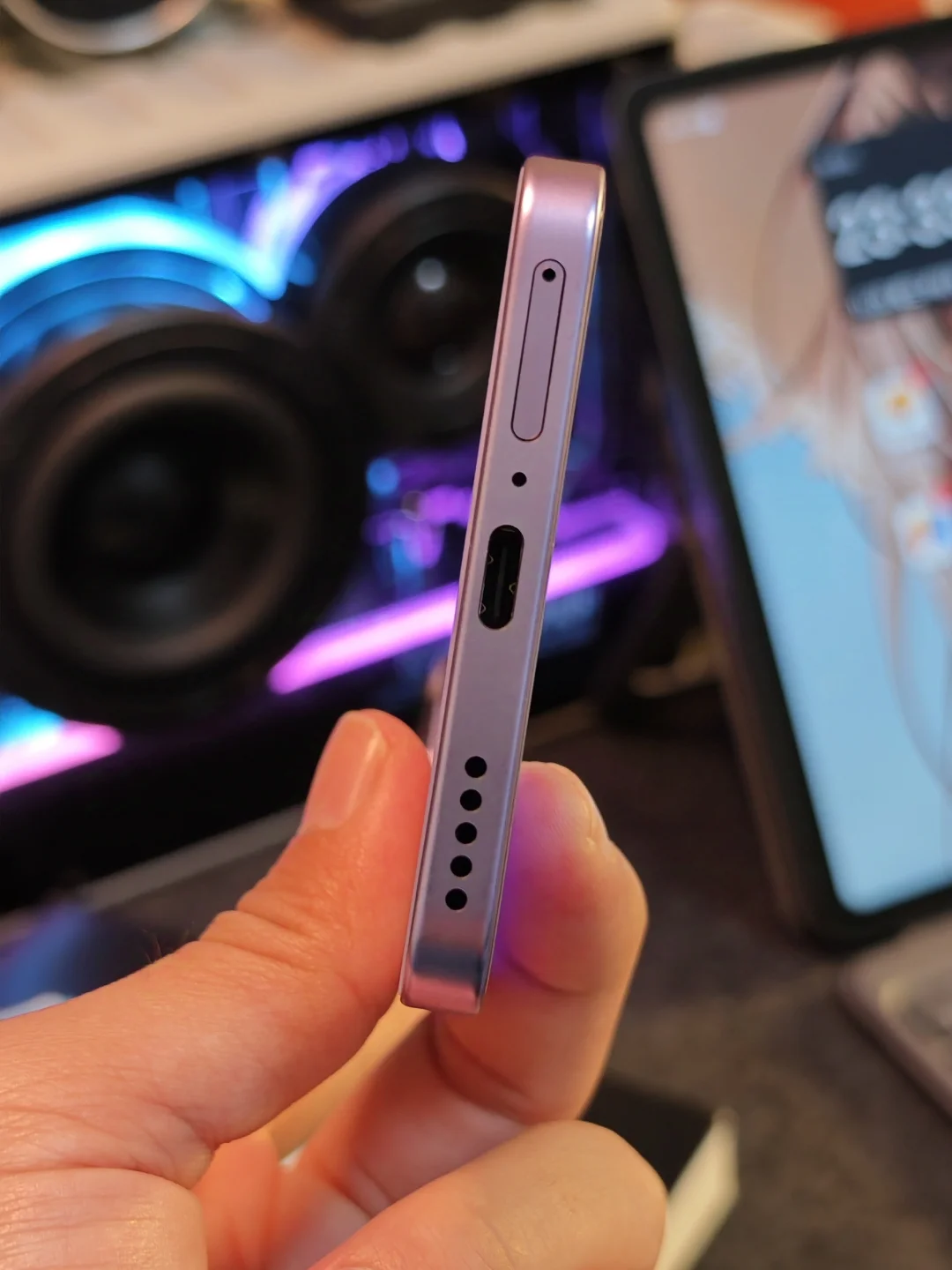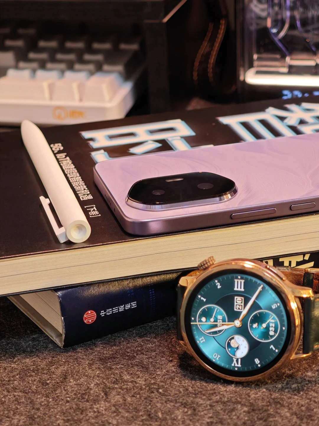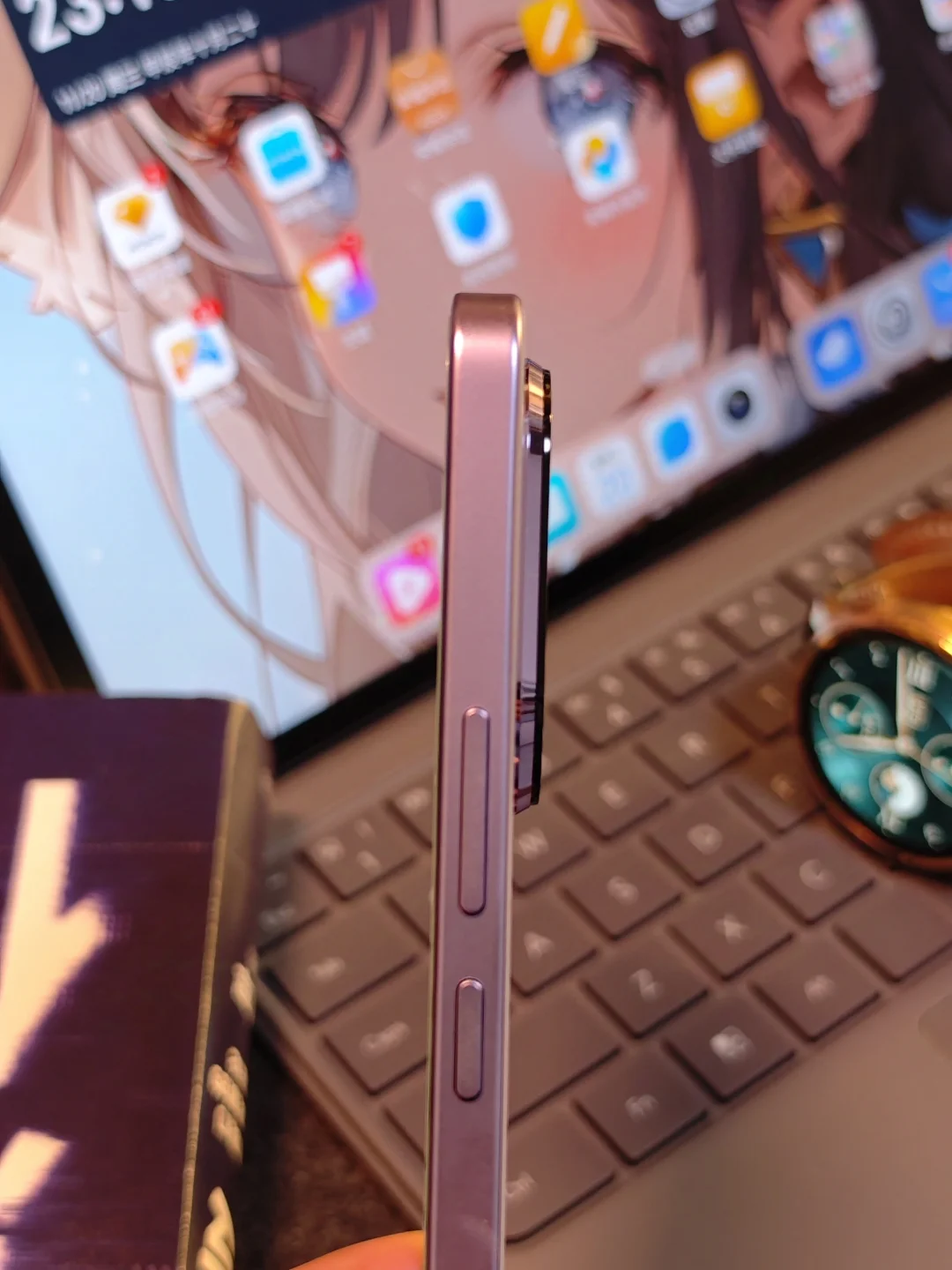 这才是荣耀300真机的样子,这是庐烟紫配色,纹理如烟如雾飘散起舞,在不同光线下折射出不同颜色,日光下是紫色,暖光下有点粉,甚是好看。手机特别轻薄,我掂量着可能是同价位最薄直屏。 后置摄像头模组是旷野舷窗设计,蕴意人生是旷野,风景在路上。所谓日照香炉生紫烟,遥看瀑布挂前川,我觉得设计师的宏愿是愿大家的旅途的美好瞬间,都能收纳舷窗之中,你说呢?