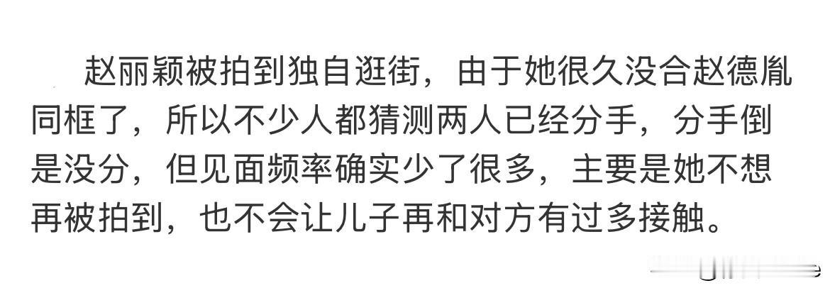 12月13日,前脚娱记拍到赵丽颖独自逛街,就有网友怀疑赵丽颖跟赵德胤分手了! 原因是已经很久没看到赵丽颖跟赵德胤同框了,自从上次娱记拍到赵德胤带想想出门后,就再也没有拍到赵德胤出现在赵丽颖家附近,网友这么一说我才反应过来! 娱记一直盯着赵丽颖,可能并不是想拍想想,而是想拍赵德胤!只是一直没拍到! 有一说一,两人都没公开过,分什么手,单身女艺人身边不能有几个单身男性朋友么?