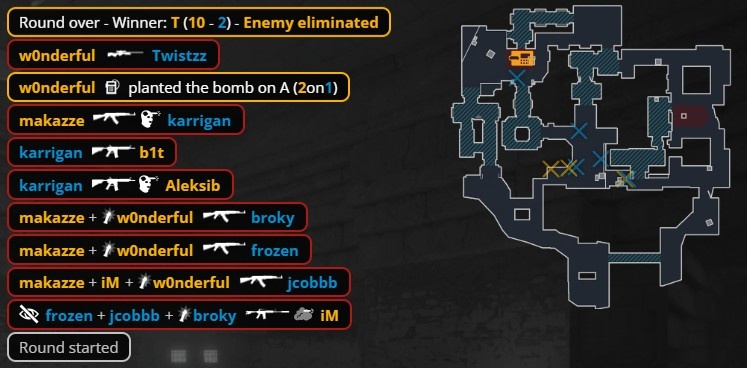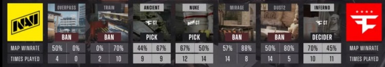 随后FaZe存钱送NAVI第7分。回到长枪回合,中路iM暴打jcobb,wonderful大狙轰掉寒王,NAVI轻松A点下包,broky大狙轰掉小李子后被C4炸掉没能保枪,第10回合,NAVI提速冲B被FaZe刚枪翻盘,但NAVI三个万元户次回合打A成功。半场结束前,makazze中路爆轰三杀,wonderful下包后大狙轰掉总监,NAVI以10-2结束上半场。
