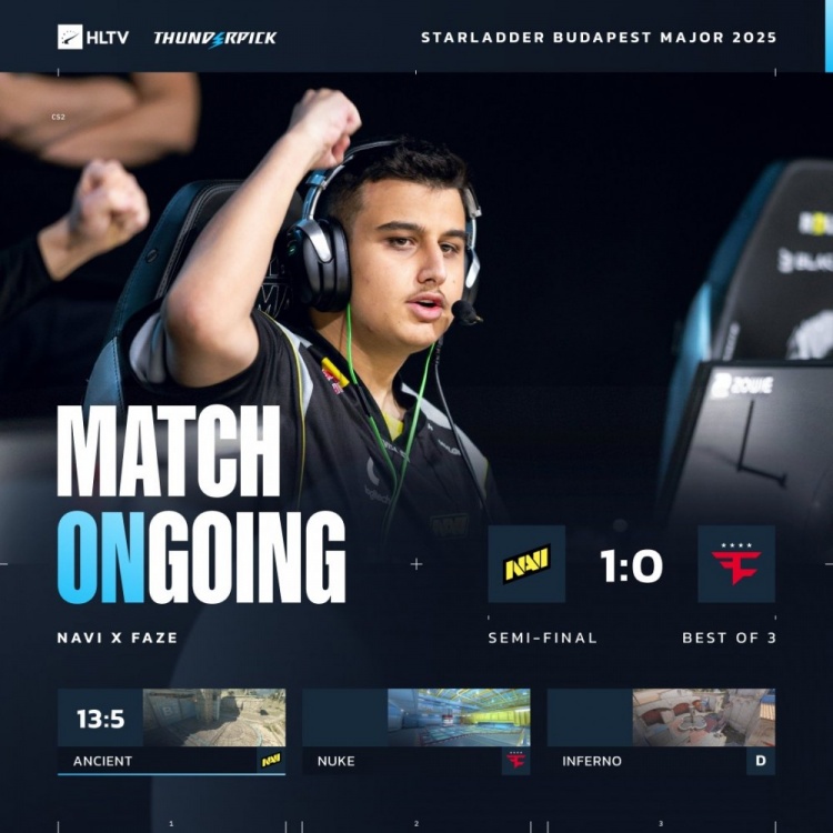 来到长枪回合,NAVI三人看B,FaZe四人来B,包点刚枪iM近点双杀让makazze与wonderful收割,NAVI拿到第11分。暂停回来,makazze联手小李子与IM三人看B固若金汤团灭FaZe拿到赛点,最终wonderful大狙三杀开场,FaZe瞬间被团灭,NAVI以13-5拿下图一。
