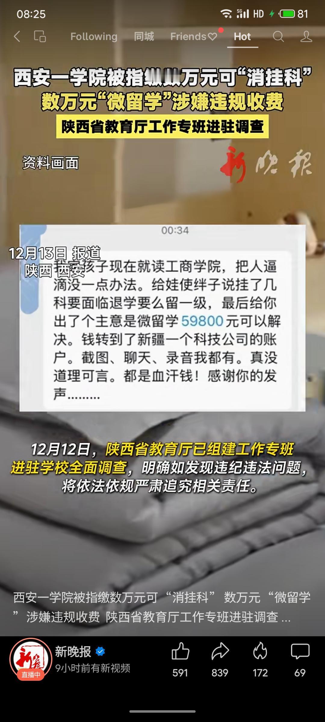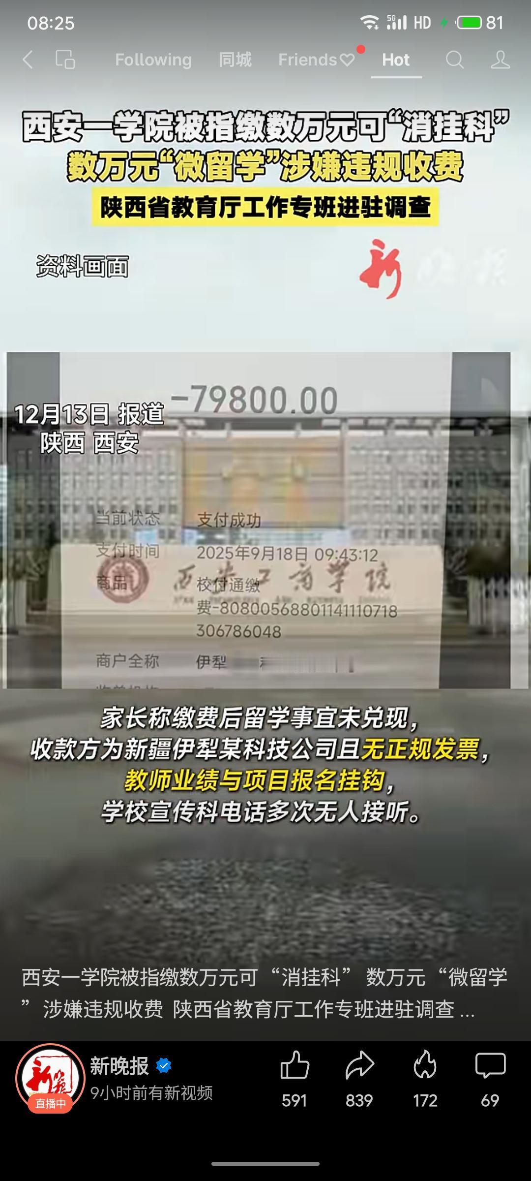 西安一学院被指借“微留学”名义向家长收取数万元费用,并承诺可“消挂科”、优先评奖。款项转入新疆伊犁某科技公司账户,且未提供正规发票。目前陕西省教育厅工作专班已进驻调查。