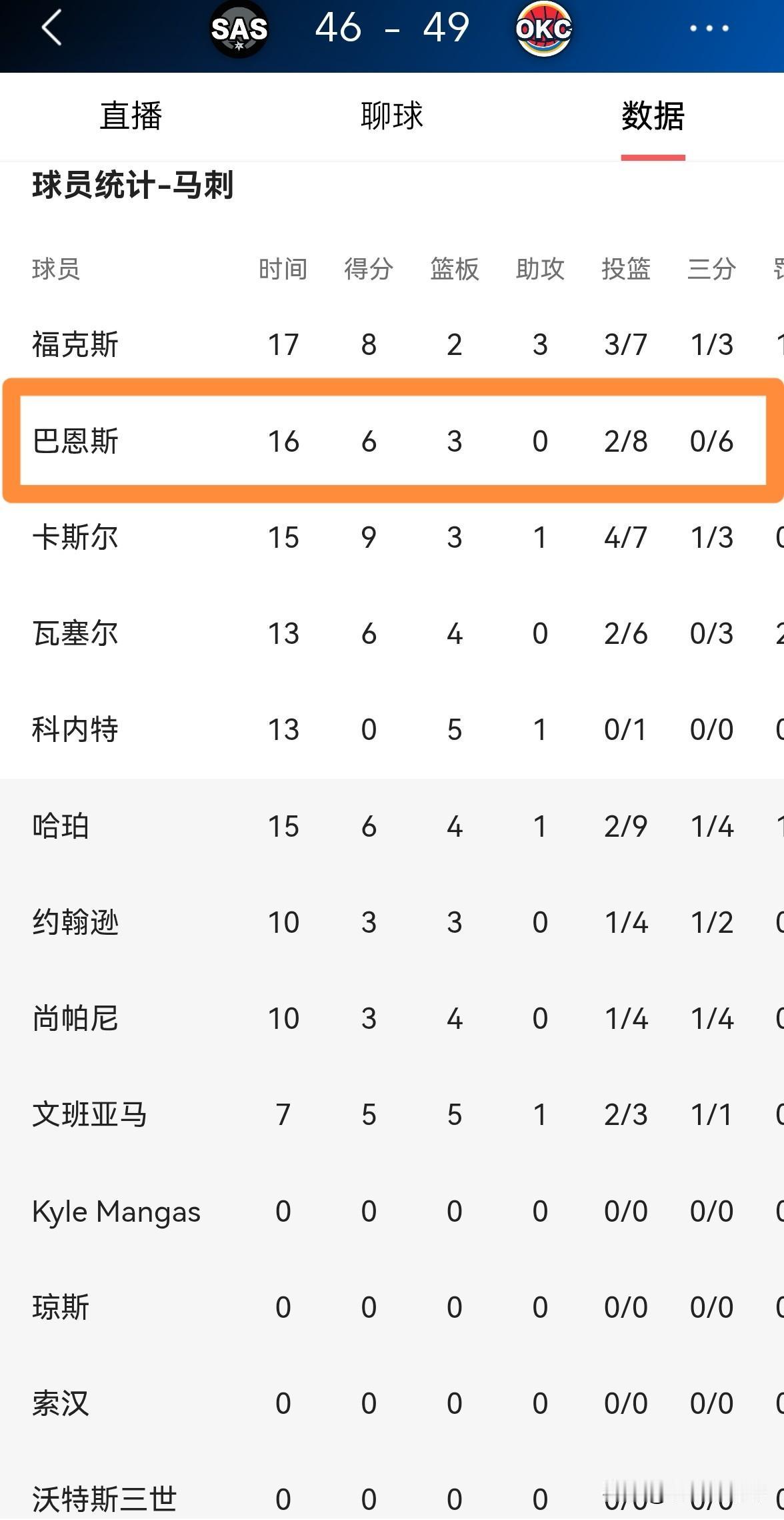 马刺老将巴恩斯真是太失常了!在今天进行的马刺和雷霆的焦点战中,目前双方的上半场比赛已经结束,马刺以46:49落后于对手。让人感到非常意外的是,向来以稳定高效著称的巴恩斯竟然失常了。 在前两节比赛中,巴恩斯首发出战16分钟,投篮8中2,其中三分球6中0、罚球4中2非常低效的得到6分。 如果巴恩斯无法在下半场比赛中提升自己的进攻效率,那么马刺很难击败实力超群的雷霆。