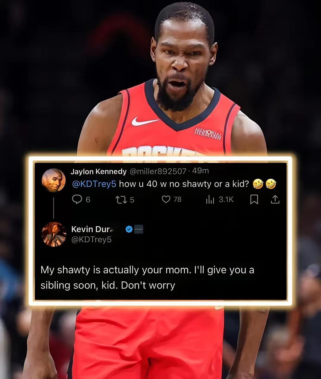 杜兰特三十大几了,依然作为一个钻石王老五独立存在于NBA联盟。和想象中的大多数球星的醉生梦死、挥金如土的生活画面,有些格格不入。杜兰特给人的感觉除了打球,就是在去往打球的路上。 杜兰特很会逗喜欢他的球迷开心,时不时也会爆出自己与爱情的点点滴滴。如杜兰特说要喝一个美国女演员斯嘉丽·约翰逊的洗澡水。最几天还在多媒体平台上和一个黑粉,关于杜兰特的女朋友话题互怼。想来,杜兰特玩心有多大吧?要等到杜兰特的孩子能打篮球的那一天,有可能詹姆斯都带着孙子在打篮球了吧?(个人观点,不喜勿喷,谢谢!)