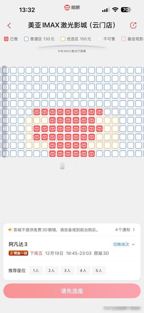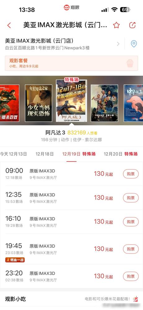 刚刚在猫眼上看到电影《阿凡达3》开始预售了,忍不住点开购票页面,发现首映当天12月19号居然有这么多人已经选好票了。 简单说下发生了啥:刷票务平台的时候看到《阿凡达3》已经能买票,首映那天的位置被挑走不少,一眼看过去还挺热闹的。 但我第一反应不是剧情,而是价格。IMAX一张要130块,说不心疼是假的,手指在“确认购票”上停了好几秒。 然后才注意到时长,198分钟。也就是说,坐下去差不多三小时多,中途不能走神,不能乱动,对膀胱和腰都挺不友好的。 我更在意的是,这种片真的很吃观影状态。状态好,可能三个小时一眨眼就过去;状态不对,十分钟都像在熬。 也有人会说这种电影不看IMAX没灵魂,但问题是,贵+久叠在一起,劝退力真的不小。 当然,也可能首映日就是给铁粉准备的,愿意为体验买单的人早就想好了,不在乎价格和时间成本。 所以我现在还在犹豫。你能原地坐满198分钟吗?如果是你,会掏这130块去电影院看《阿凡达3》吗?