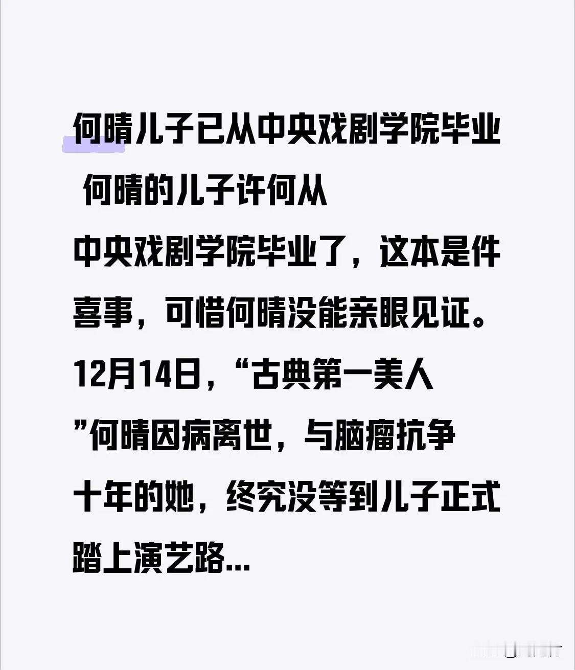 何晴儿子已从中央戏剧学院毕业 何晴儿子许何已从中央戏剧学院毕业,这原本是件喜事,可惜何晴没能亲眼见证。12月14日,“古典第一美人”何晴因病离世,与脑瘤抗争十年,她终究没等到儿子正式踏上演艺路。 何晴演艺生涯堪称传奇,14岁进入浙江昆剧团,演遍四大名著中的经典美人,还是首位出演琼瑶剧的大陆女星,两次提名百花奖最佳女主角。她感情路虽有波折,但和许亚军“离婚不离亲”。许何毕业典礼上,许亚军和张澍都在,传说张澍对许何视如己出,他们感情很好。不过许何长相没完全遗传父母神颜,倒有点像张澍,或许真是“谁养得像谁”。期待许何出道后的表现。 何晴照片 许诗晴扮演者
