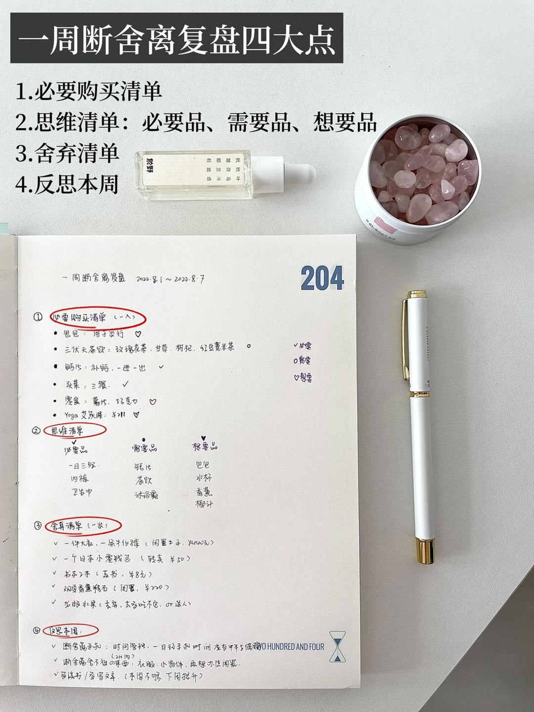 这就是结合断舍离这本书提到的欲望清单和舍弃清单,结合手帐本,作出的一周断舍离复盘。上次的月复盘也得到大家的喜欢,周复盘可以做的简单点,我用了10分钟做了复盘,更加清晰了。也舍弃了想买但蕞后没买的包包,发现自己的支出的少了好多。