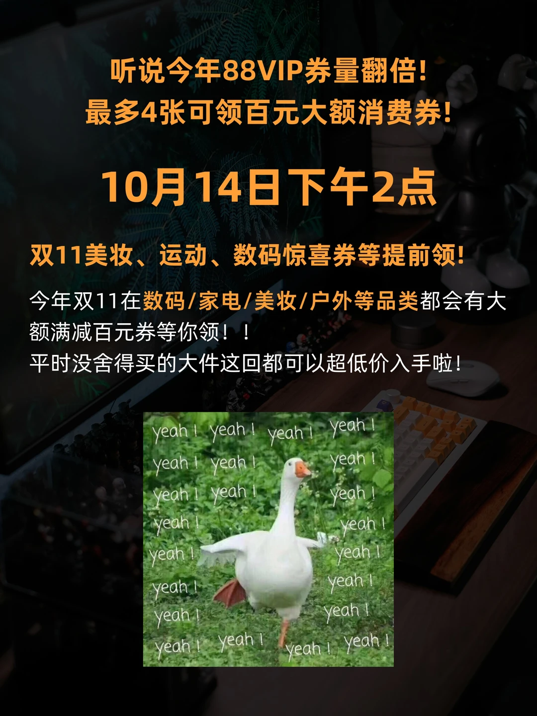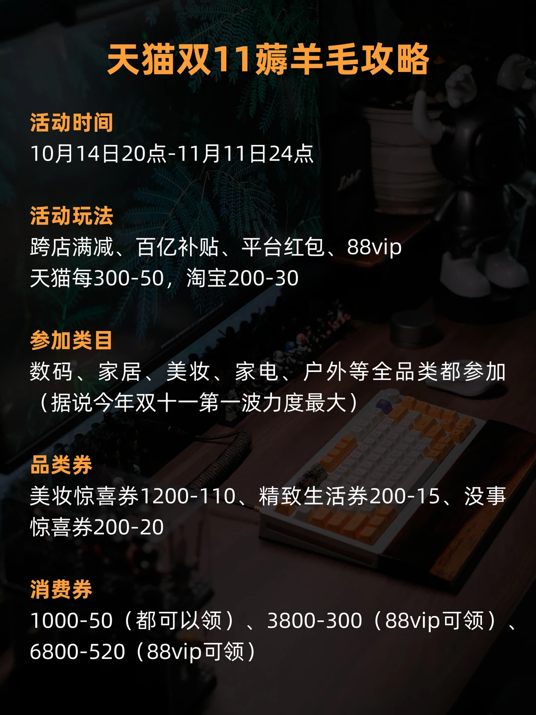 一年一次的天猫双11又双叒叕来啦!😍 作为一名数码博主,绝对不能错过这样的薅羊毛时机[自拍R] 给大家整理了一些抢券的时间和内部消息的预测,希望大家都能狠狠地薅一波羊毛![偷笑R][偷笑R] 10月14日下午14点,超多大额惊喜券等提前领!而且听说今年88VIP券量翻倍🤩 宝子们,盯紧14号抢起来,错过再等一年😭!!!