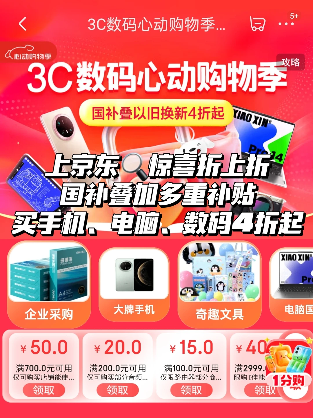 👉 现在打开京东 APP,直接搜索🔍【惊喜折上折】进入活动页面,国补叠加多重补贴,手机、电脑、数码产品 4 折起就能拿下!