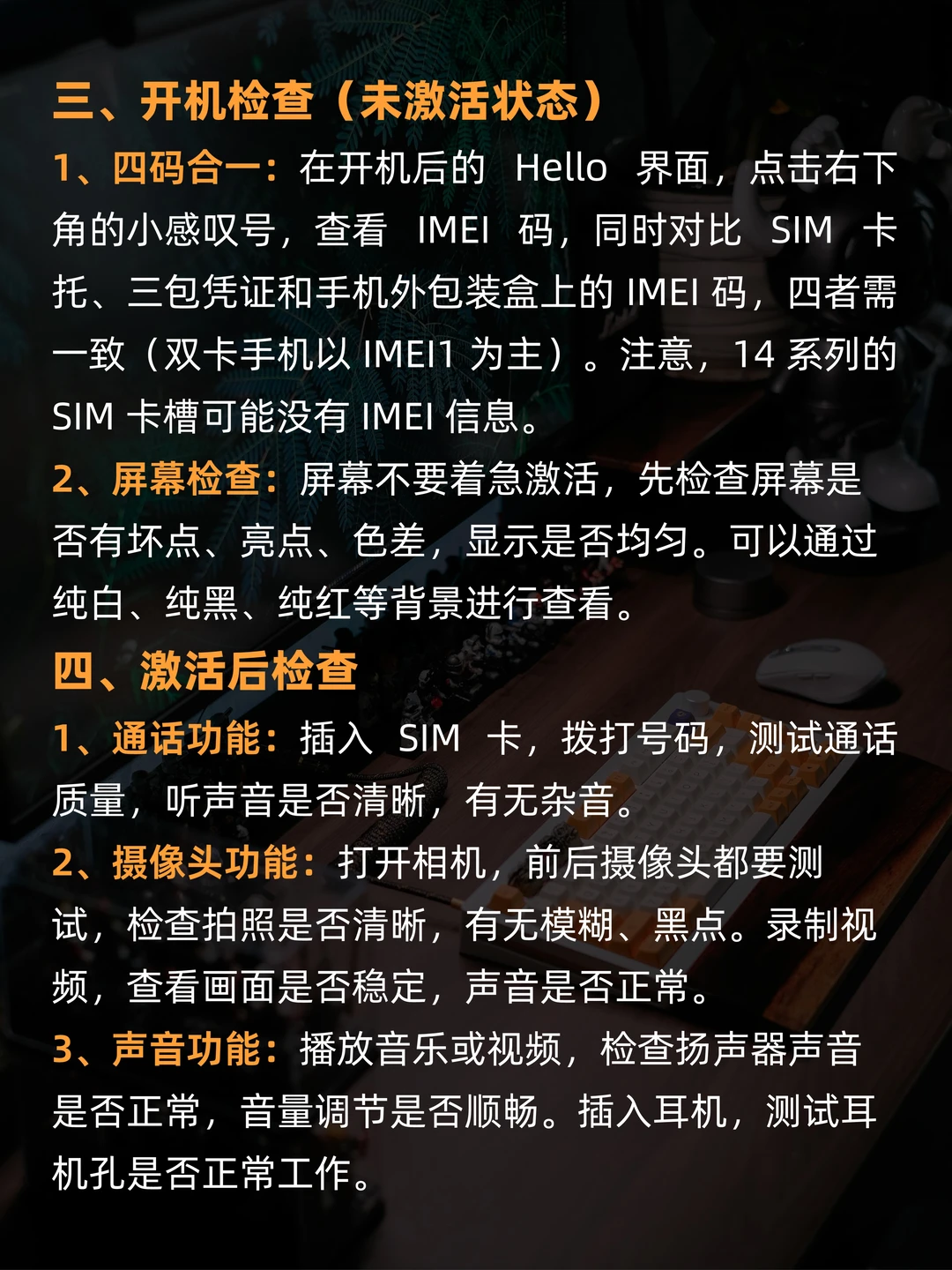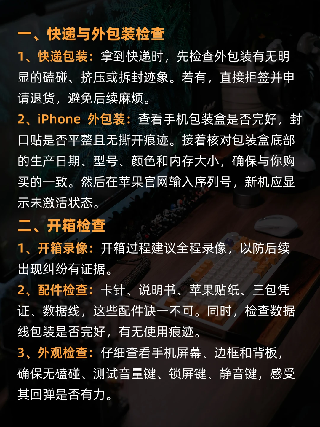 ▪iPhone 包装:查盒子是否完好,封口贴无撕开;核对底部生产日期、型号等;官网输序列号查激活状态