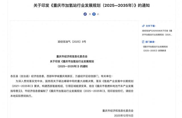 规划期间内,重庆将根据技术进步、市场匹配需求与行业发展需要,对规划进行适时调整。同时,重庆将强化政策支持,构建涵盖审批管理、规划建设、运营服务、财政支持等多维度政策体系,加大资金扶持力度,多渠道鼓励、引导社会资本参与氢能产业;各区县要结合行业发展规划与辖区实际,做好辖区内加氢站选址与国土空间规划衔接工作,保障用地有效落实。