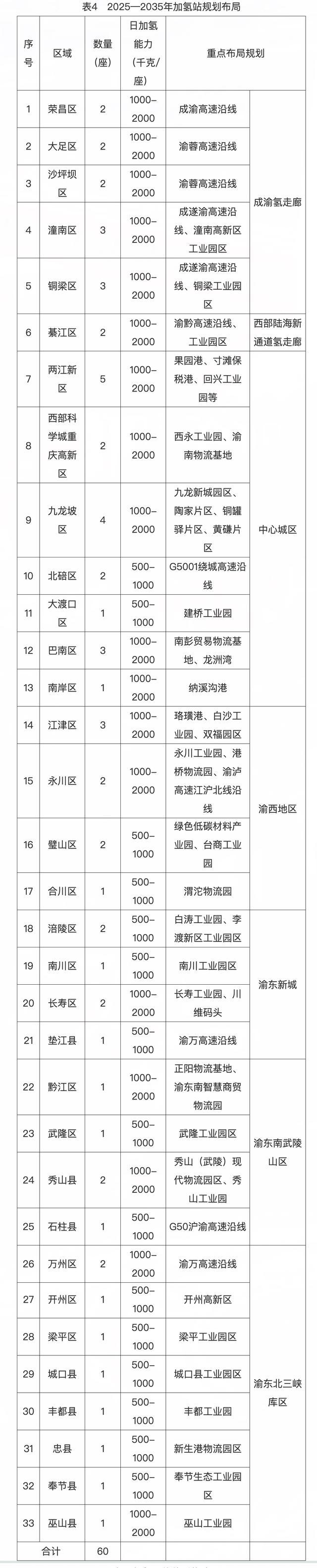 规划提到,重庆将以构建全域加氢网络为核心,通过分步实施建站规划,打造“网络完善、供需适配、智能安全”的现代化加氢基础设施体系,为氢燃料电池汽车规模化推广应用提供坚实支撑,全面赋能氢能产业高质量发展。到2035年,全市规划新建加氢站60座,累计建成加氢站达到72座,氢气供应能力达到2500万千克/年。