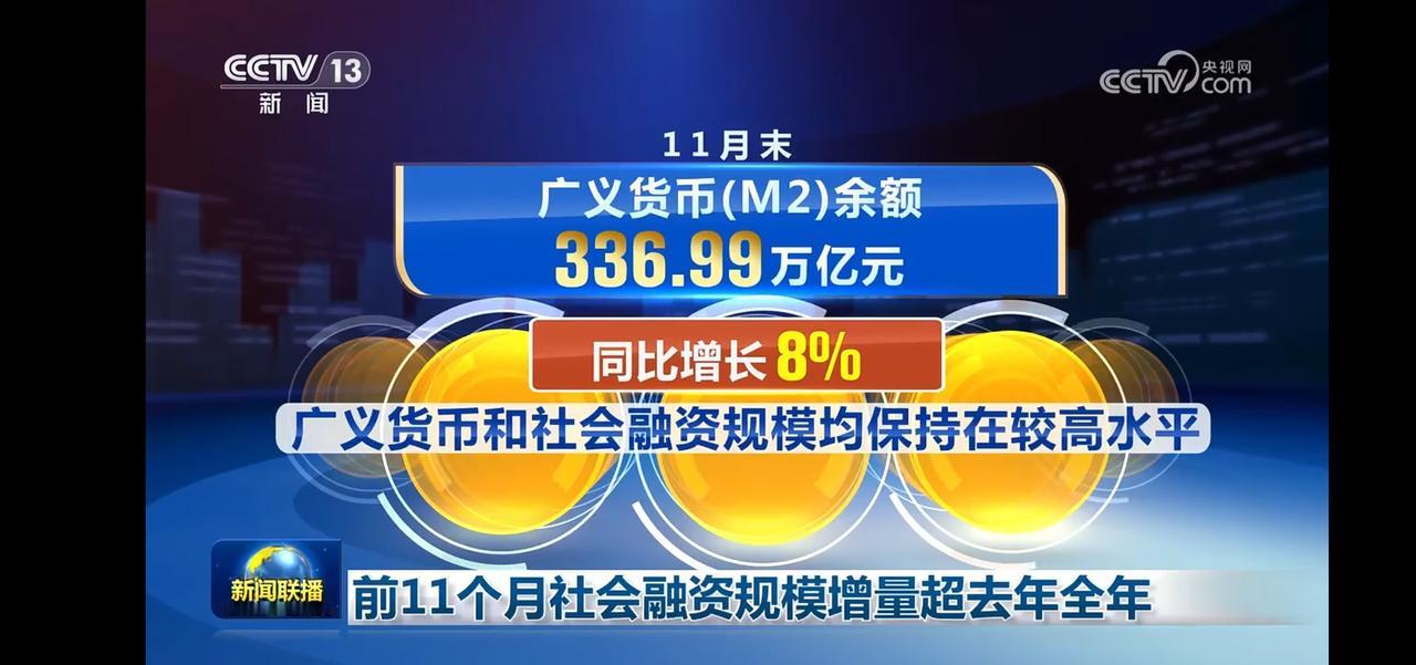 前11个月社会融资规模增量超去年全年,达到33.39万亿元 M2余额336.99万亿元,同比增长8%