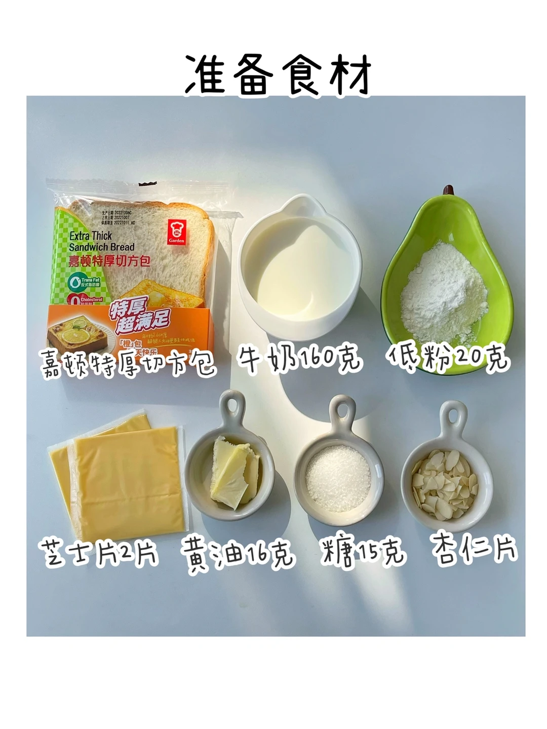 ✅准备食材:嘉顿特厚切方包2片、牛奶160克、黄油16克、低粉20克、芝士片2片、砂糖15克、杏仁片适量。