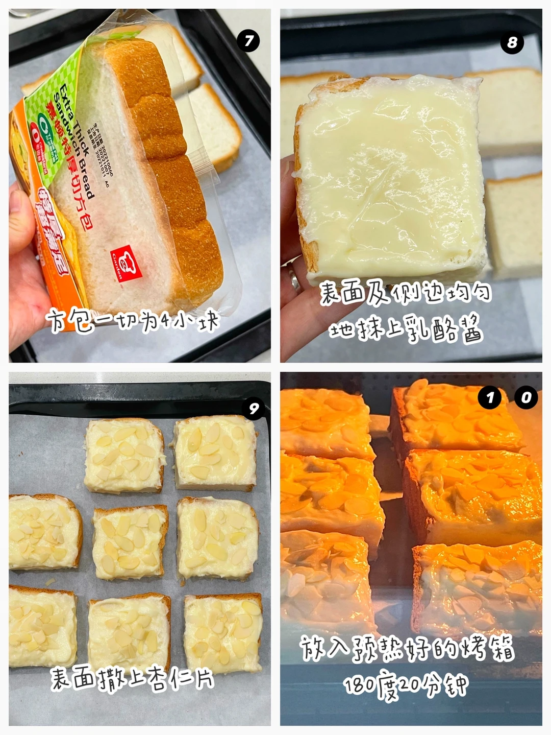 🔹方包横竖切成4小块,表面均匀的涂上乳酪酱,涂的厚一些,侧边也要涂上哦,吃起来会更浓郁。