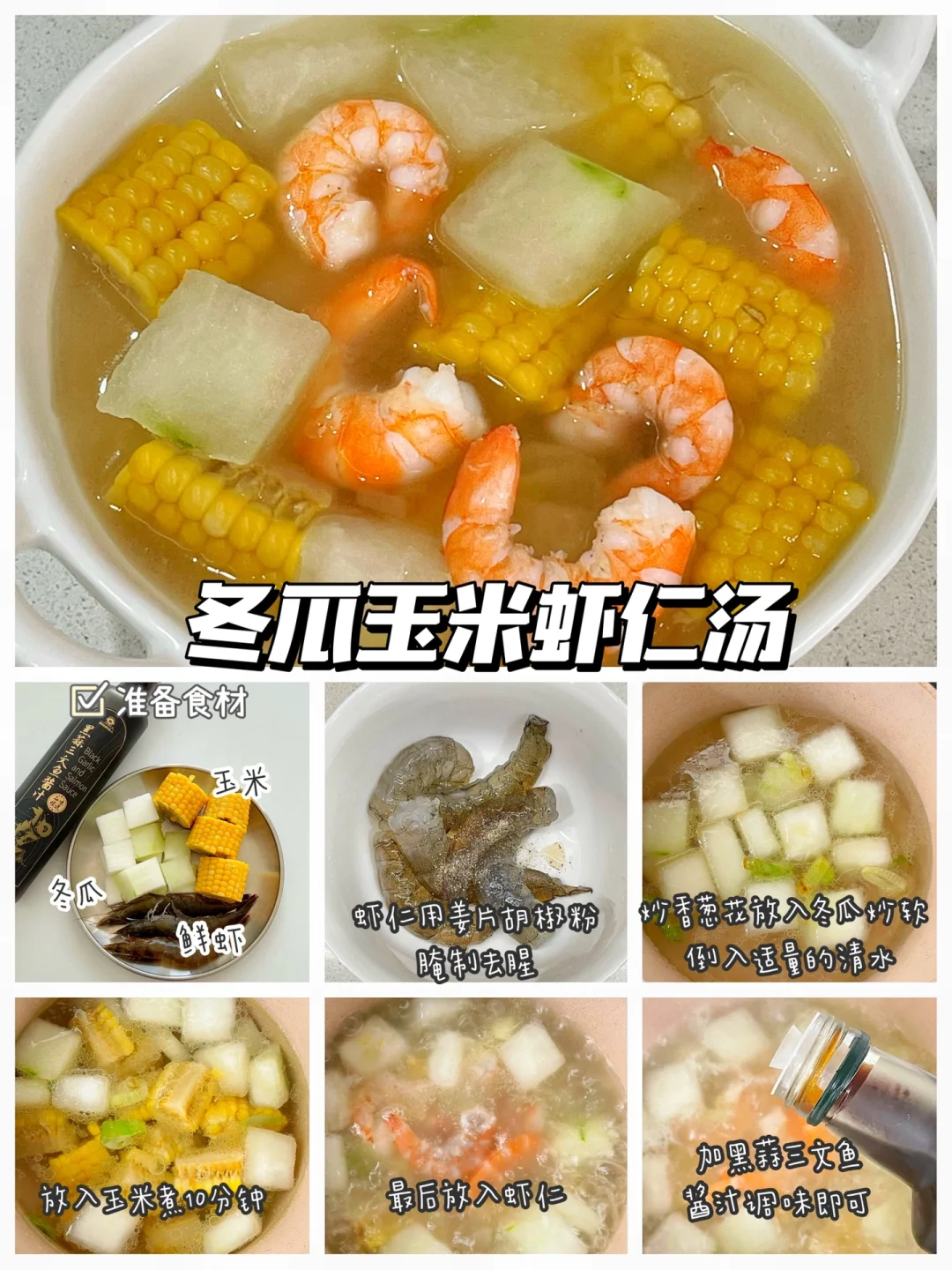 🔹制作方法:虾仁用胡椒粉和姜片腌制一会。炒香葱花,放入冬瓜炒软,倒入适量的清水,放入玉米煮10分钟,最后放入虾仁,加酱汁调味即可。