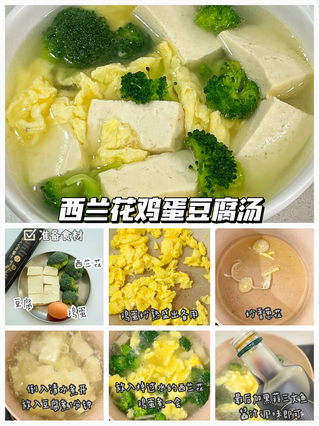 🔹制作方法:鸡蛋炒熟盛出备用。炒香葱花,倒入清水煮开放入豆腐块煮1分钟,放入焯过水的西兰花,鸡蛋碎煮一会,最后加酱汁调味即可。