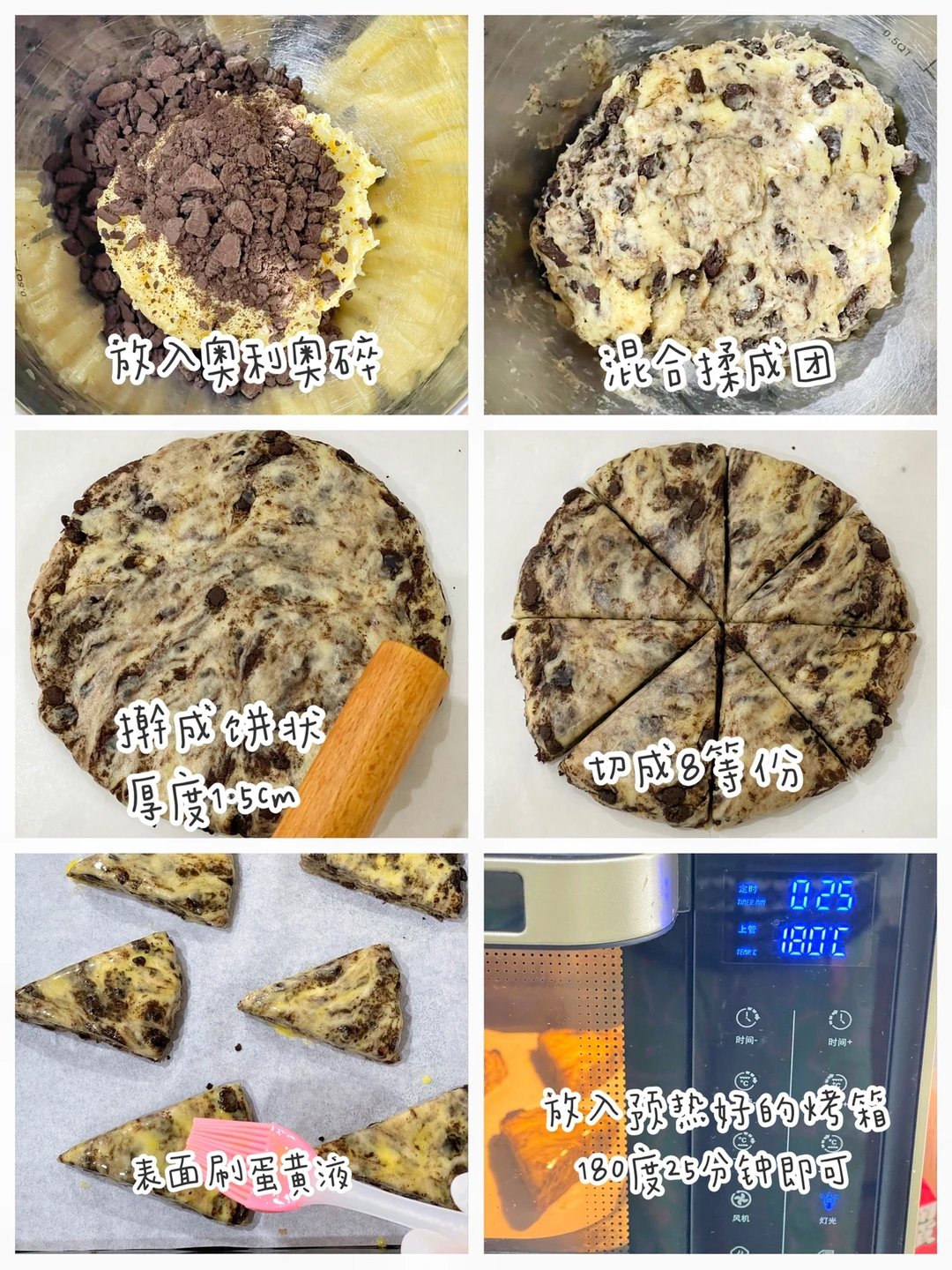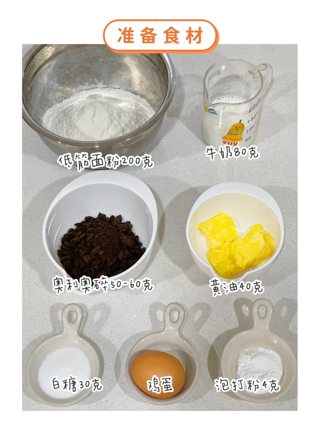 ✅准备食材:低筋面粉200克、鲜奶80克、黄油40克、白糖30克、鸡蛋1个、泡打粉4克、奥利奥碎50~60克
