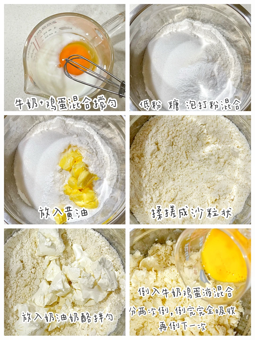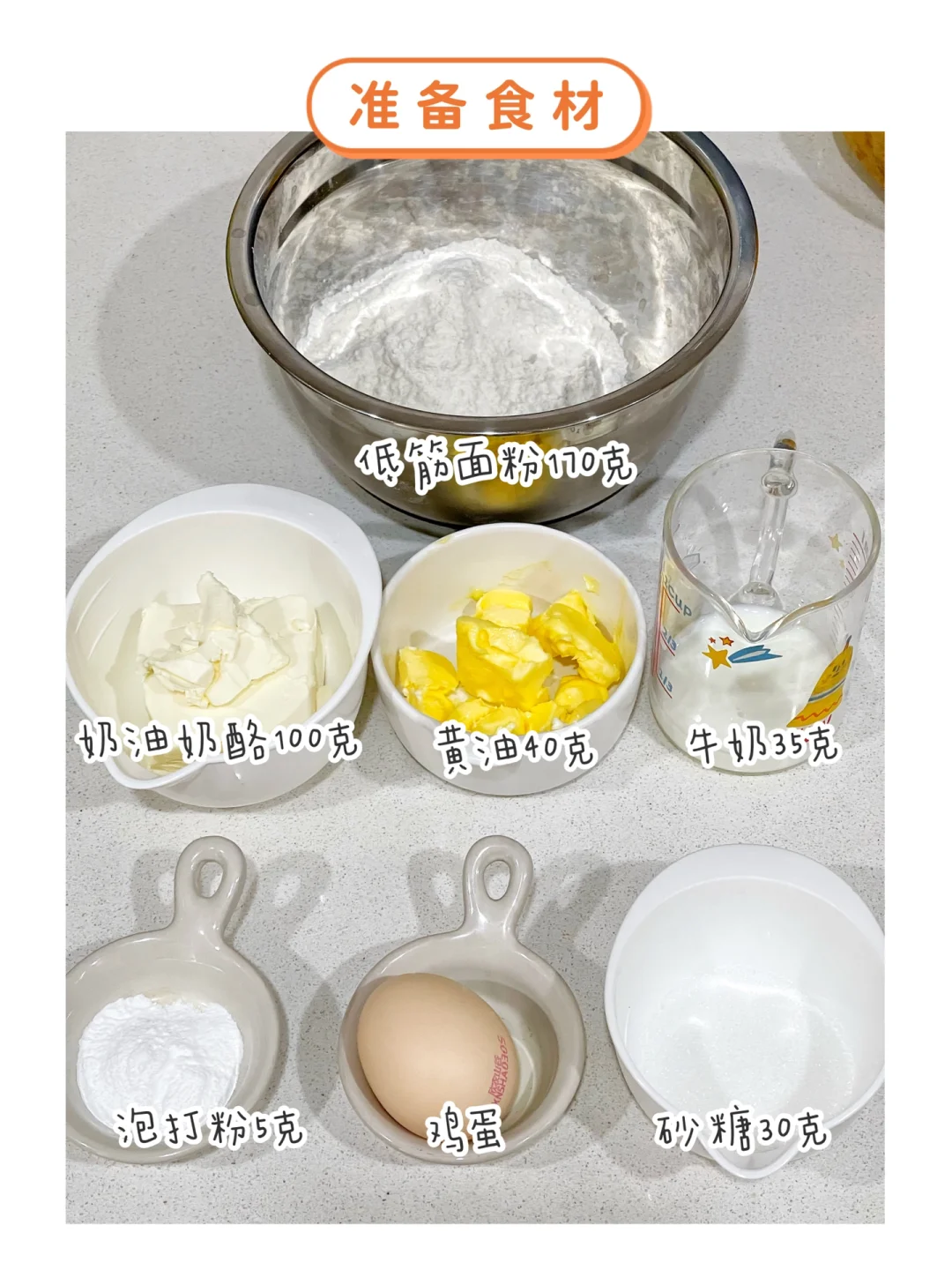 ✅准备食材:低筋面粉170克、黄油40克、牛奶35克、奶油奶酪100克、泡打粉5克、鸡蛋、砂糖30克。