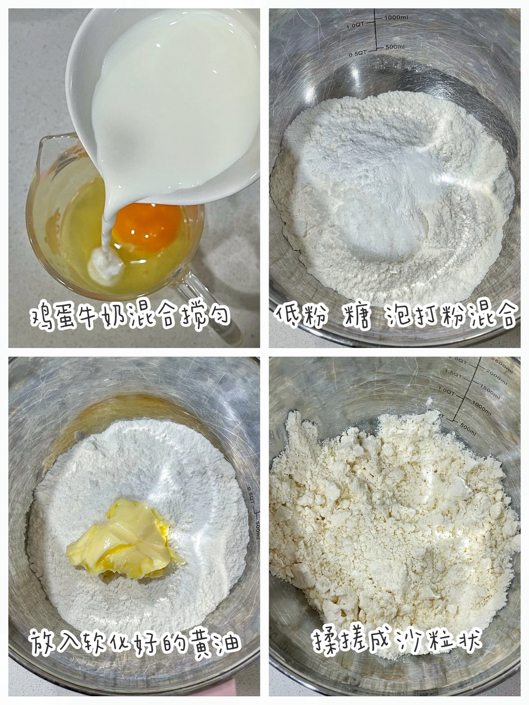 🔹低粉+糖+泡打粉混合,放入软化好的黄油,用手揉搓成沙粒妆。