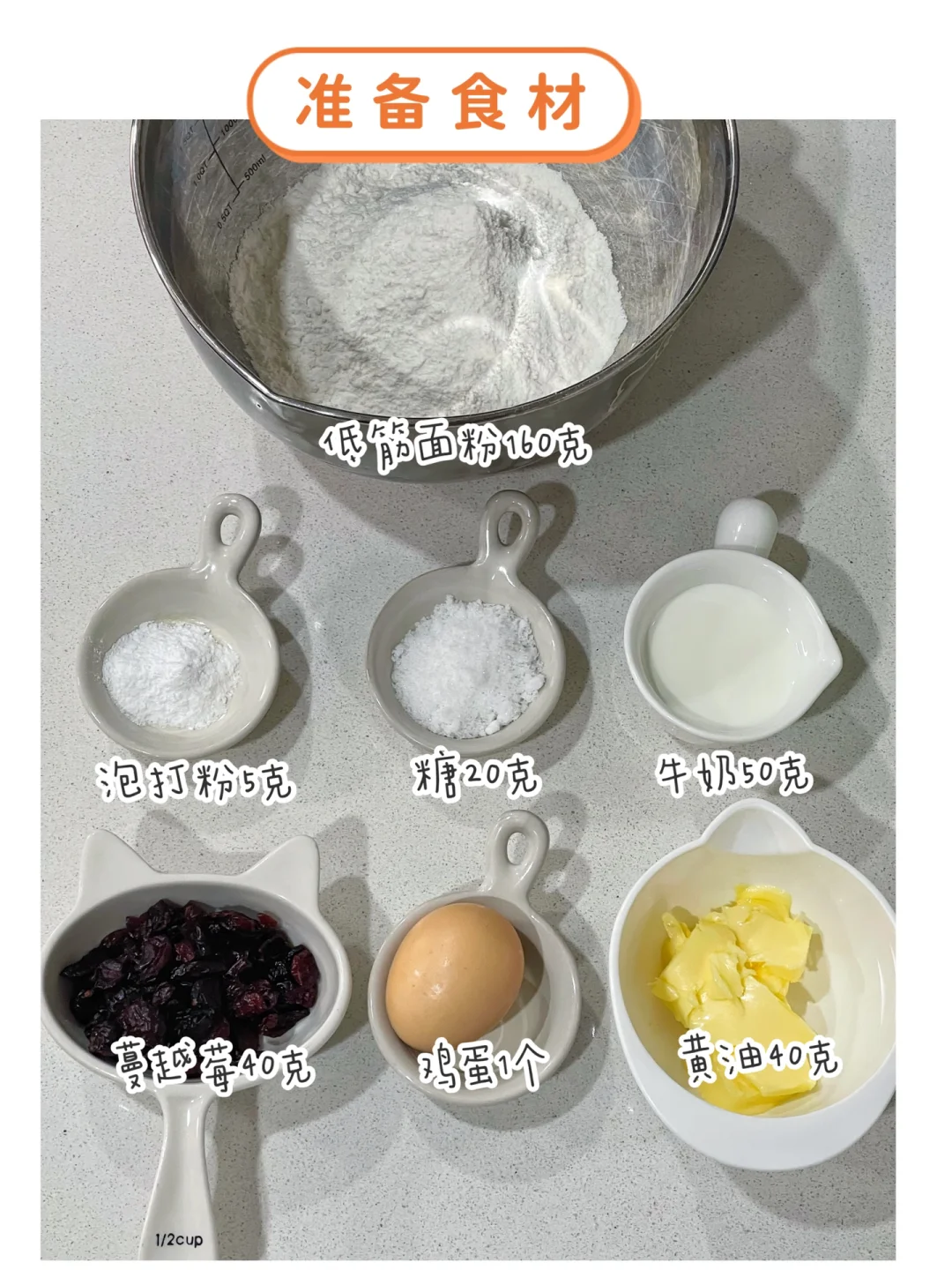 ✅准备食材:低筋面粉160克、牛奶50克、泡打粉5克、糖20克、黄油40克、鸡蛋1个、蔓越莓40克