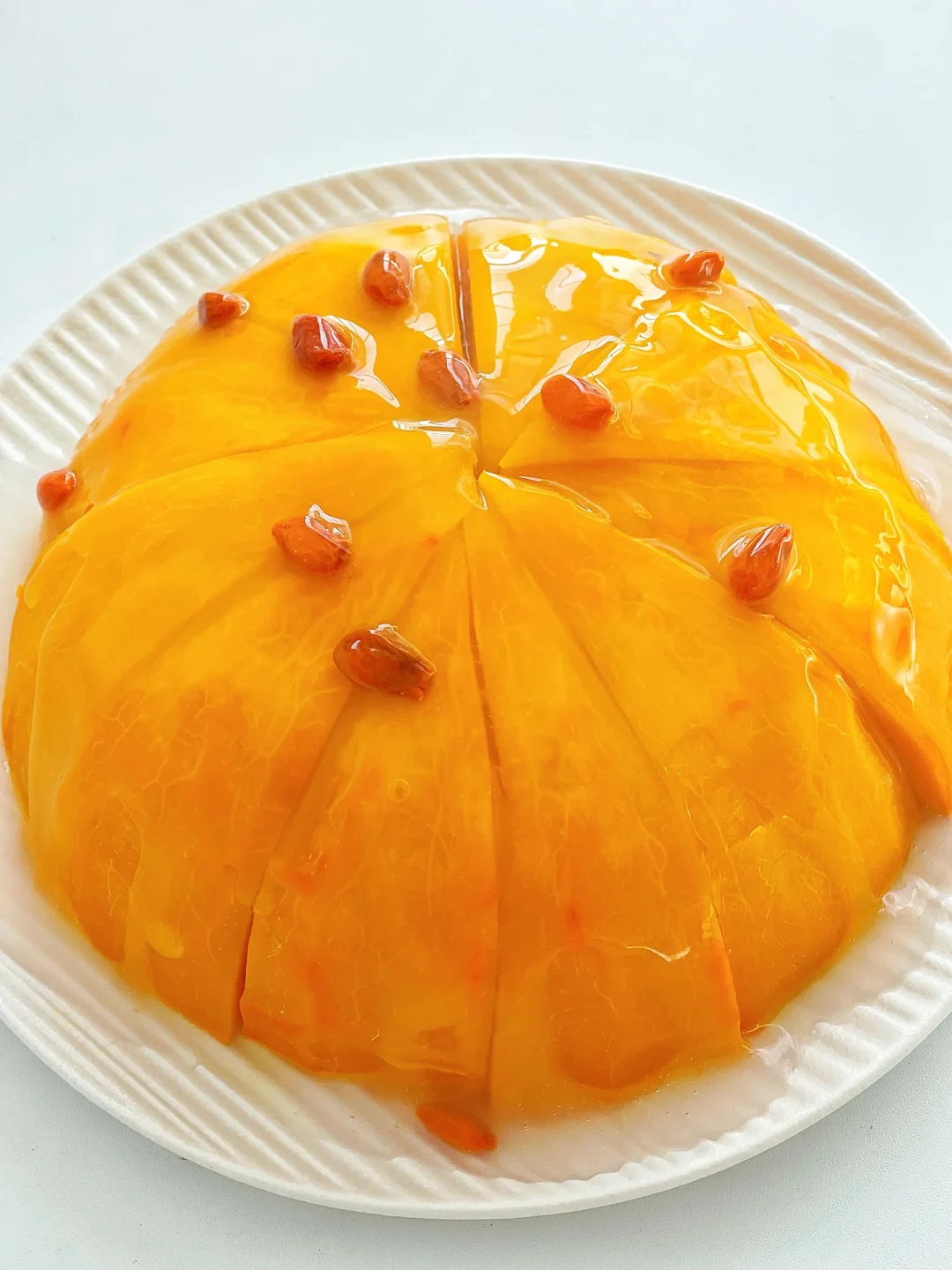 🔹蒸好后,找一个大一点的盘子盖在南瓜上反扣过来.