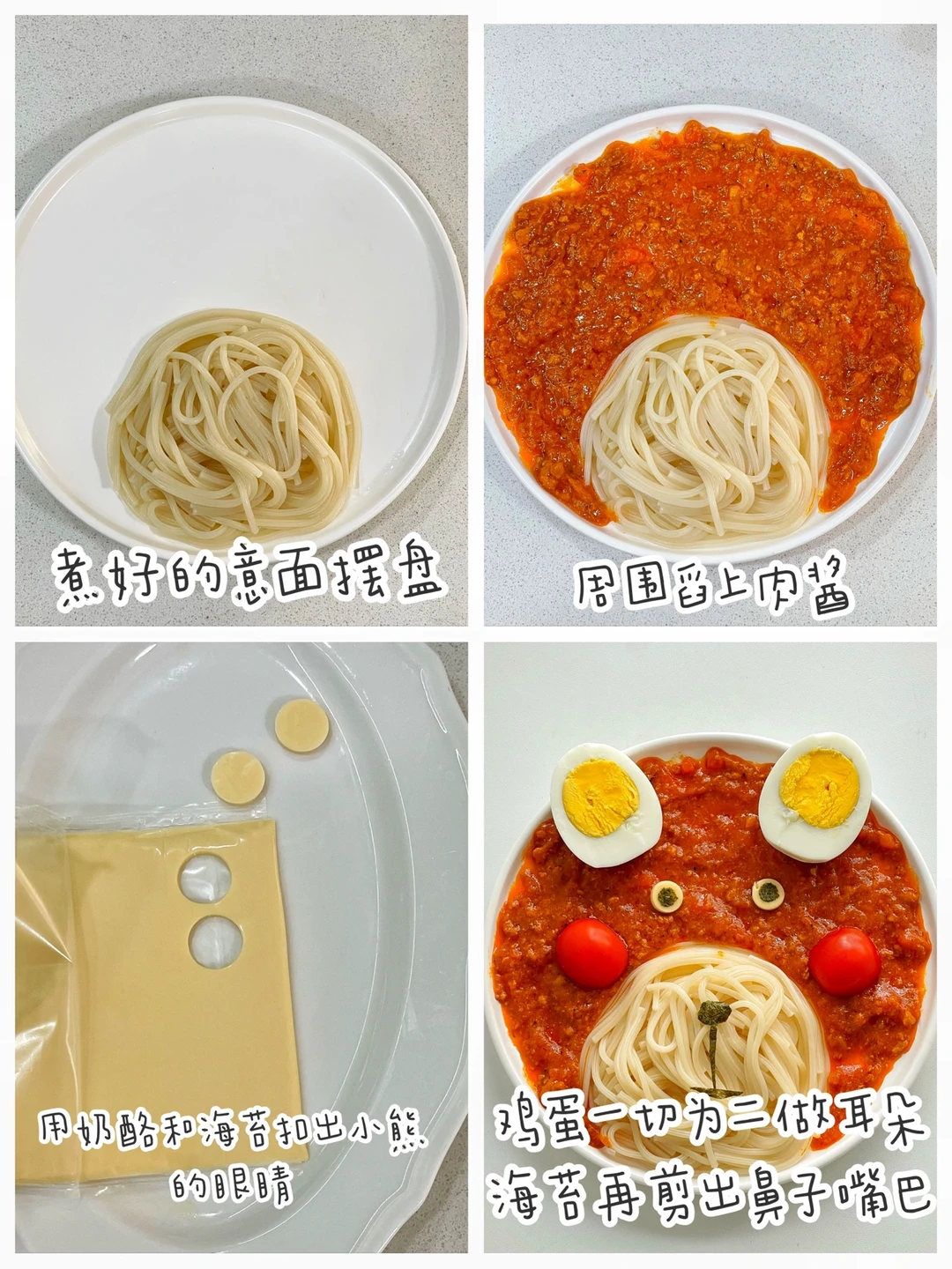 今天安排了宝宝超爱吃的番茄肉酱意面,造型还摆成了宝宝超喜欢的小熊模样,可可爱爱,宝宝分分钟光盘。 ✅准备食材:忆小口儿童意面、番茄肉酱包、橄榄油、鸡蛋、海苔片、芝士片、圣女果。 ⬇️制作方法:⬇️ 🔹锅中水开后打入橄榄油包,倒入意面,煮8分钟左右。🔹另起一锅倒入肉酱包搅匀加热。 🔹煮好的意面摆盘中摆成圆形,在周围舀上肉酱。用芝士和海苔剪出眼睛部分。用海苔剪出鼻子和嘴巴,圣女果当腮红。 🔹就是这么简单就可以搞定一个可爱的摆盘哦。