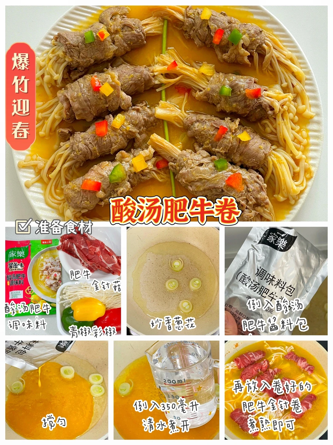 🔹食材:肥牛、金针菇、青椒彩椒、家乐酸汤肥牛调味料