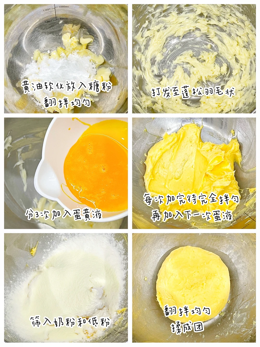 ✅准备食材:低筋面粉100克、奶粉12克、黄油80克、蛋黄液30克、糖粉20克。