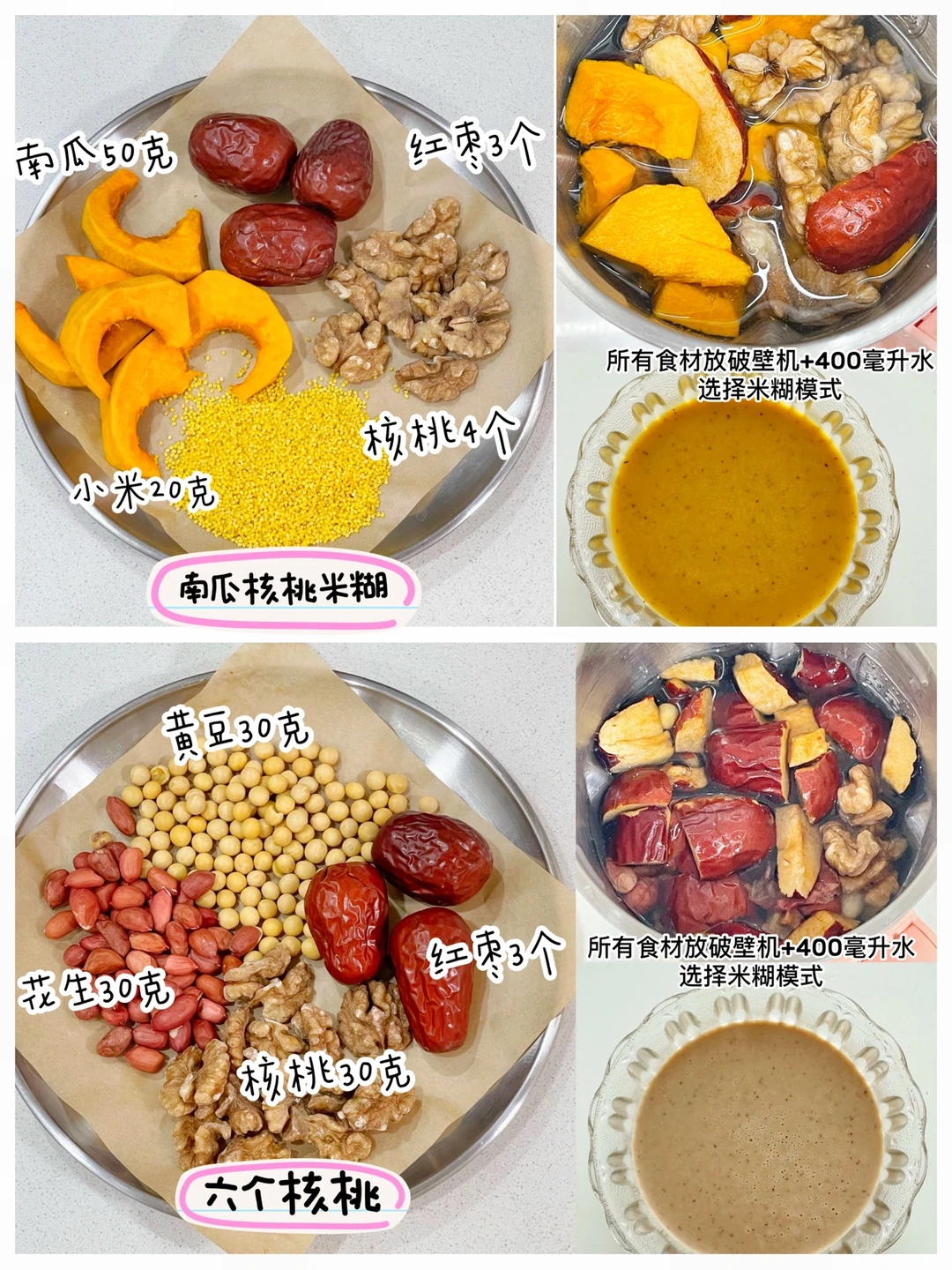 ✅南瓜核桃米糊:南瓜50克、核桃4个、小米20克、红枣3个、清水400毫升