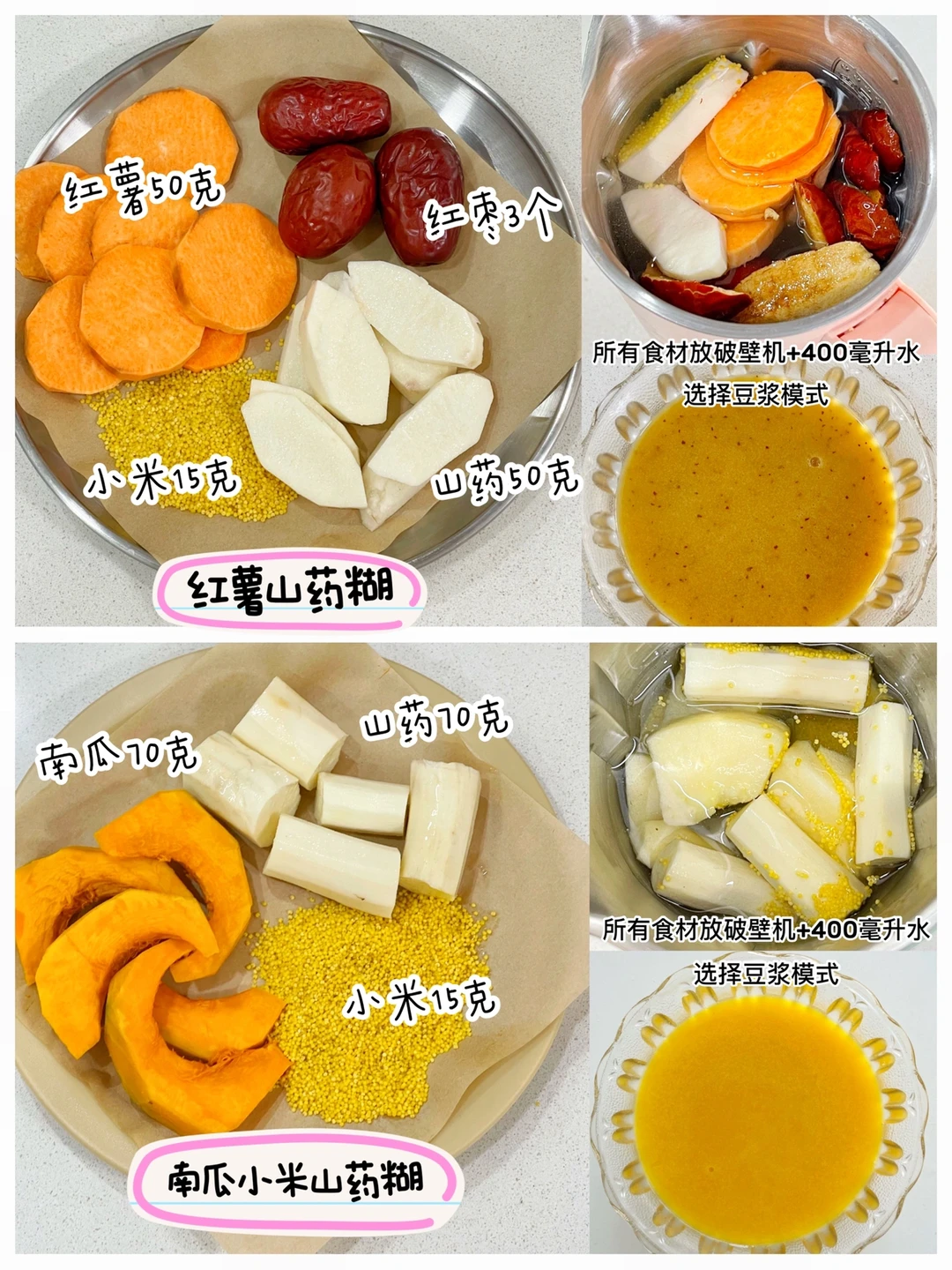 ✅红薯山药米糊:红薯50克、红枣3个、小米15克、山药50克、清水400毫升