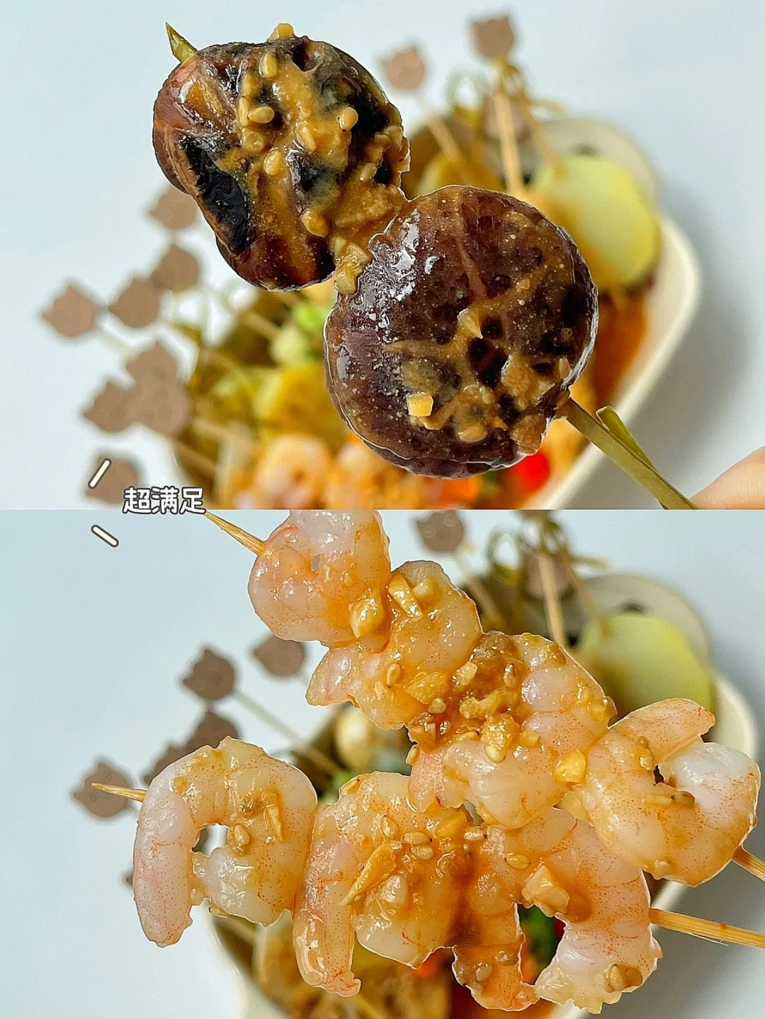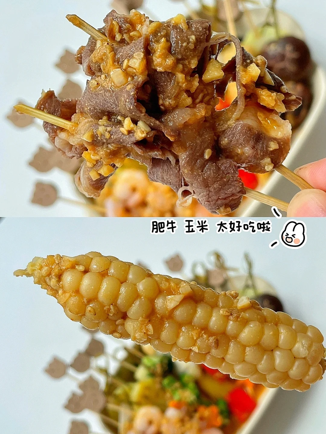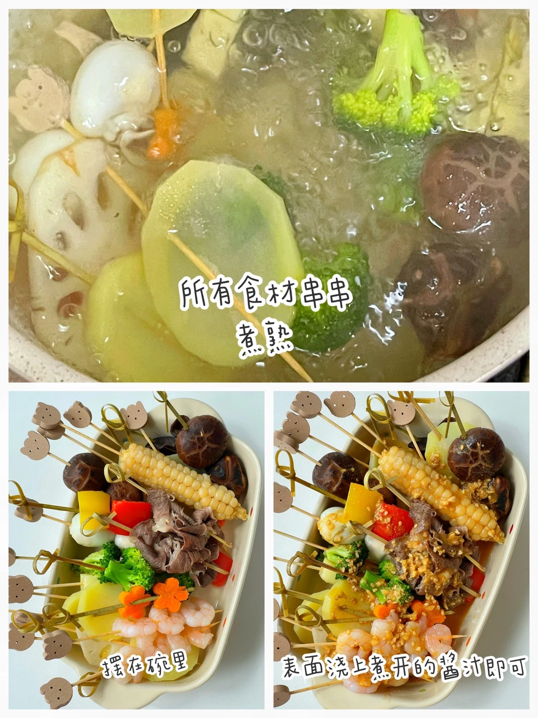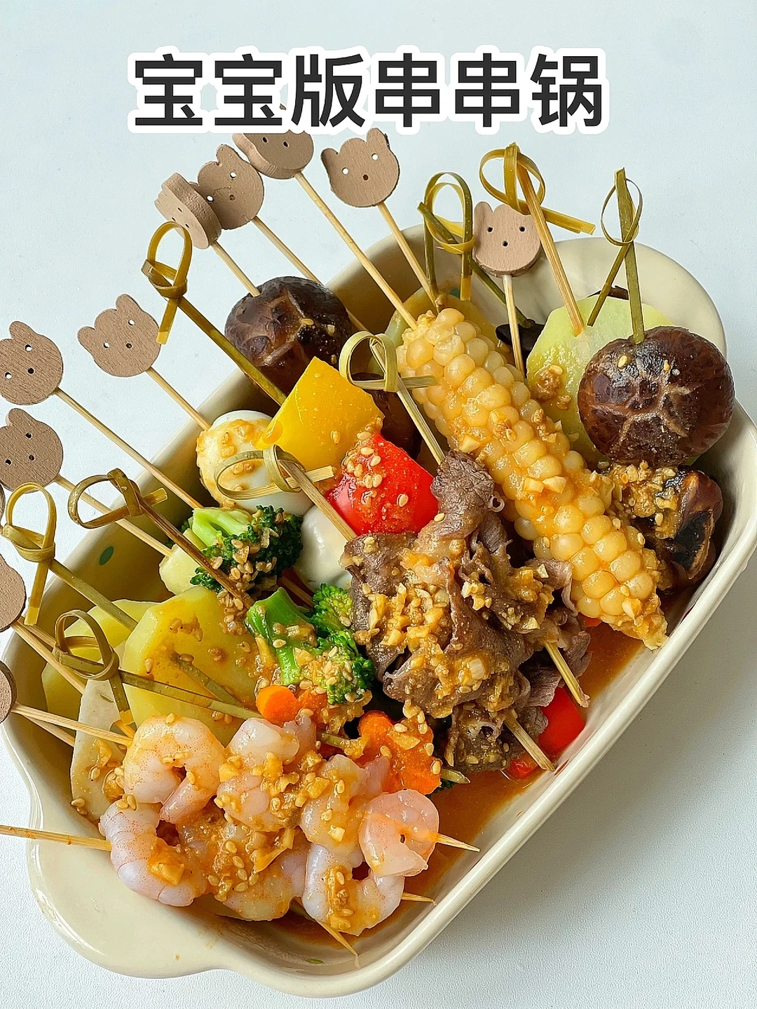 宝宝不爱吃饭可以试试今天这个宝宝版串串锅哦,有菜有肉荤素搭配,配上香浓的酱汁,超级下饭,主要做法还简单,串一串,煮一煮就可以轻松搞定[斜眼R] ✅准备食材:肥牛、虾仁、香菇、木耳、胡萝卜、玉米、角瓜、彩椒、土豆片(还可以搭配任意喜欢的蔬菜) ✅做法: 🔹竹签提前开水烫一下. 🔹把食材切成适合串串儿的大小,串成串煮熟. 🔹一勺蒜末+熟芝麻+一勺酱油+一勺番茄酱+2勺花生酱+大半碗清水调匀,倒入锅中煮开. 🔹把酱汁浇在煮熟的食材表面即可.