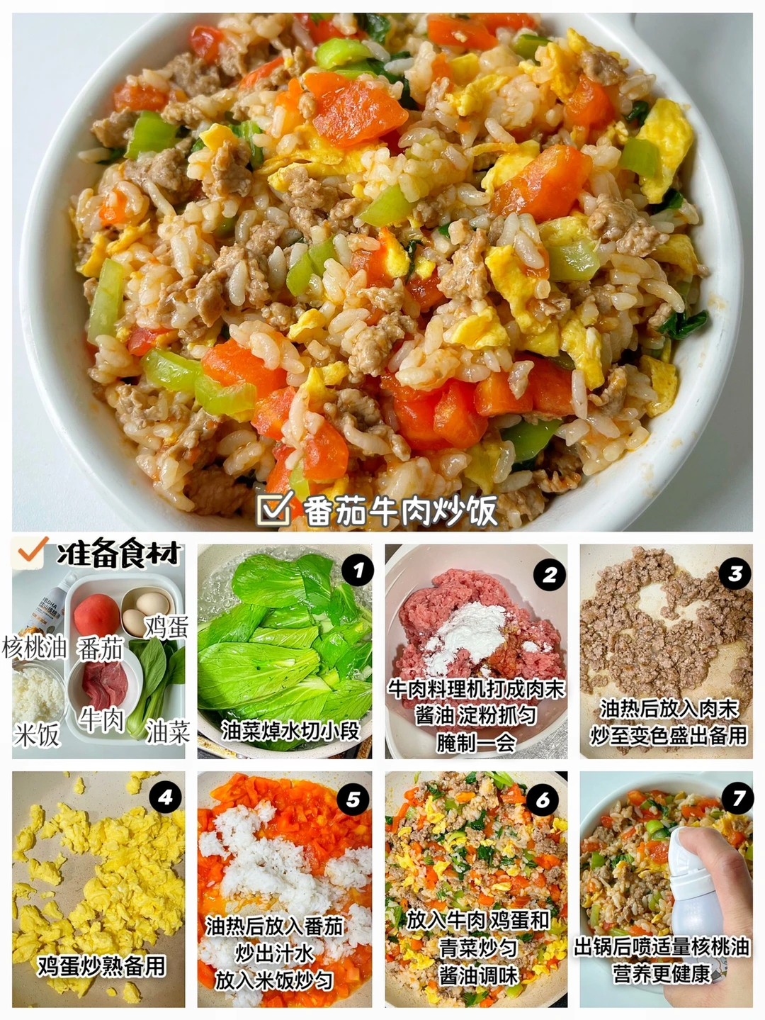 🔹制作方法:油菜焯水切小段,鸡蛋炒熟备用。牛肉提前姜片去腥,放料理机打成肉末,加适量酱油、淀粉抓匀腌制一会。油热后放入肉末翻炒变色盛出备用。另起一锅,油热后放入番茄炒出汁水放入米饭拌匀。放入牛肉末+鸡蛋碎+青菜拌匀,加酱油调味。出锅后喷核桃油拌匀即可。