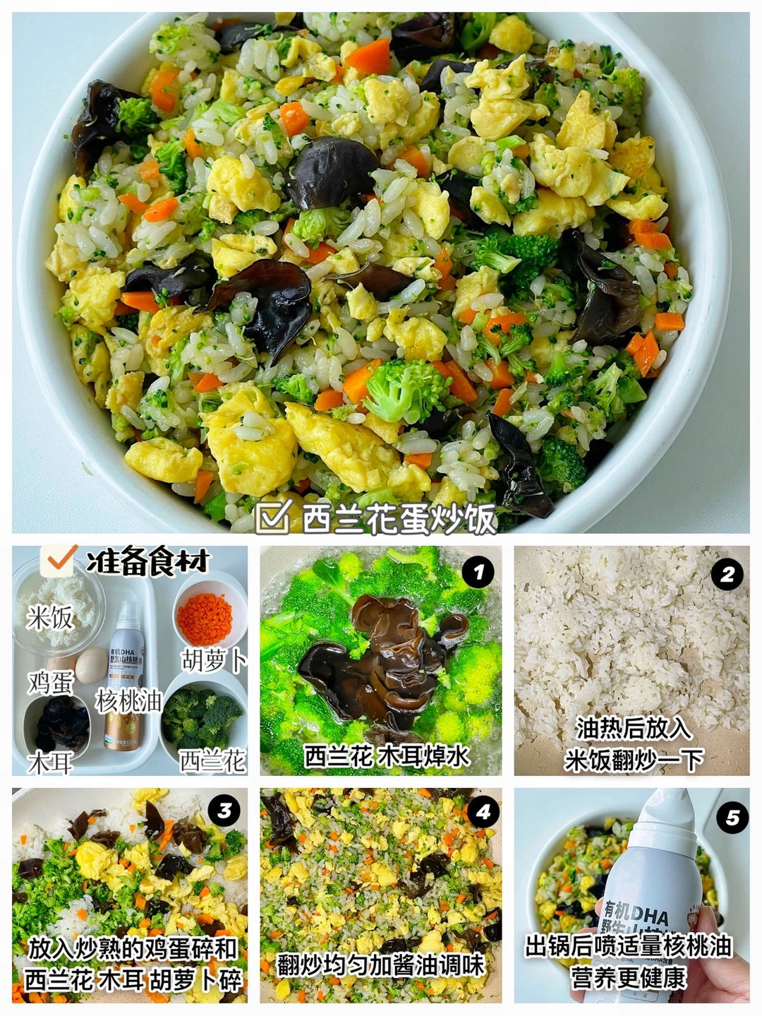 🔹制作方法:鸡蛋炒熟备用,西兰花、木耳、胡萝卜焯水切小块。油热后放入米饭炒开,放入鸡蛋碎+西兰花+木耳+胡萝卜碎翻炒均匀,加酱油调味。出锅后喷适量宝宝核桃油拌匀即可。