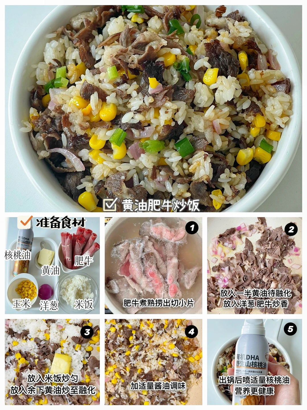 🔹制作方法:肥牛烫熟捞出切小片。油热后放入一半黄油待融化,放入洋葱和肥牛炒香。放入米饭和玉米粒炒开,再放入余下黄油炒至融化,加酱油调味。出锅后喷宝宝核桃油拌匀即可。