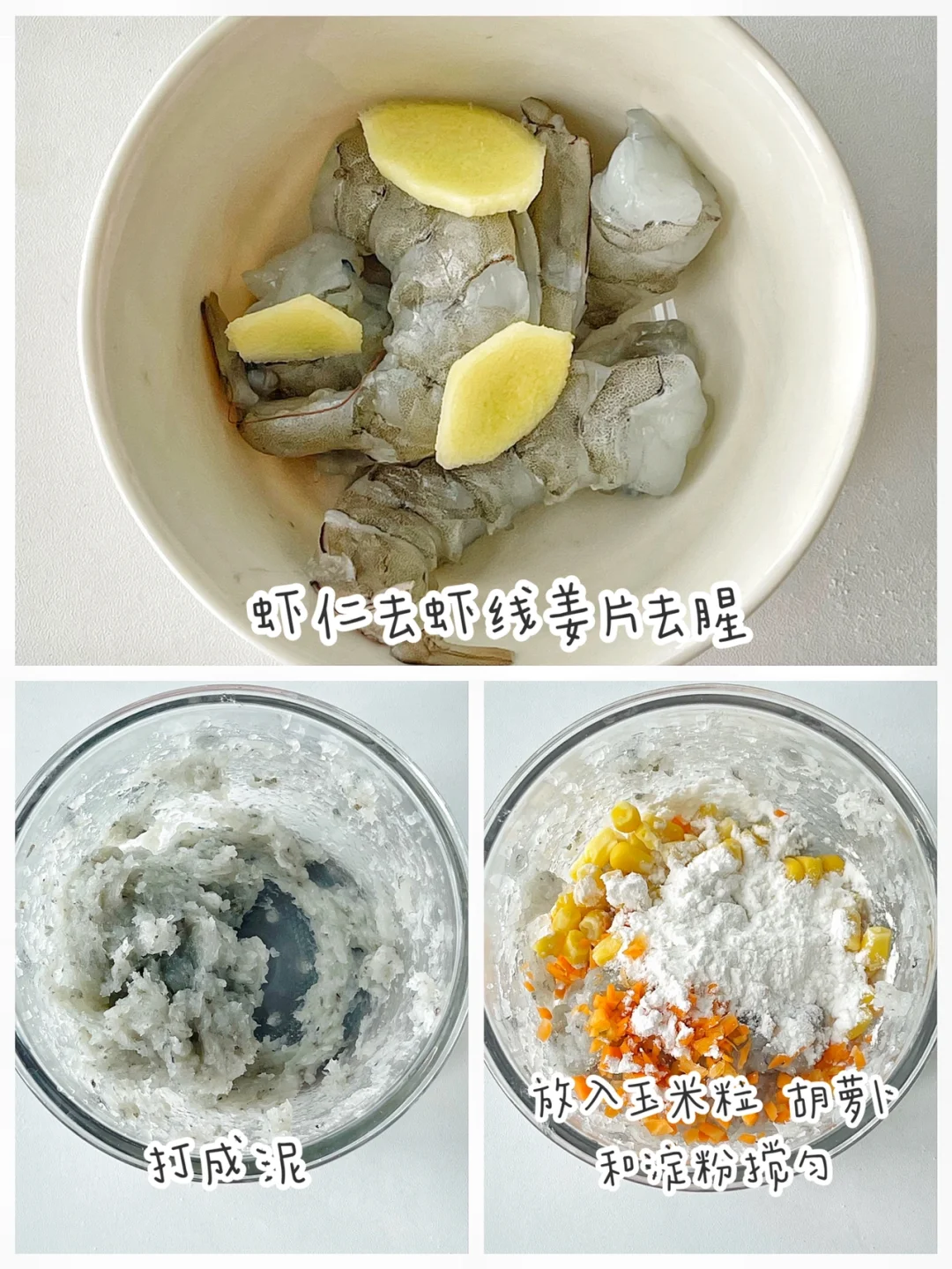 🔹放料理机打成虾泥。放入胡萝卜、玉米粒和淀粉搅匀,整成圆饼状。