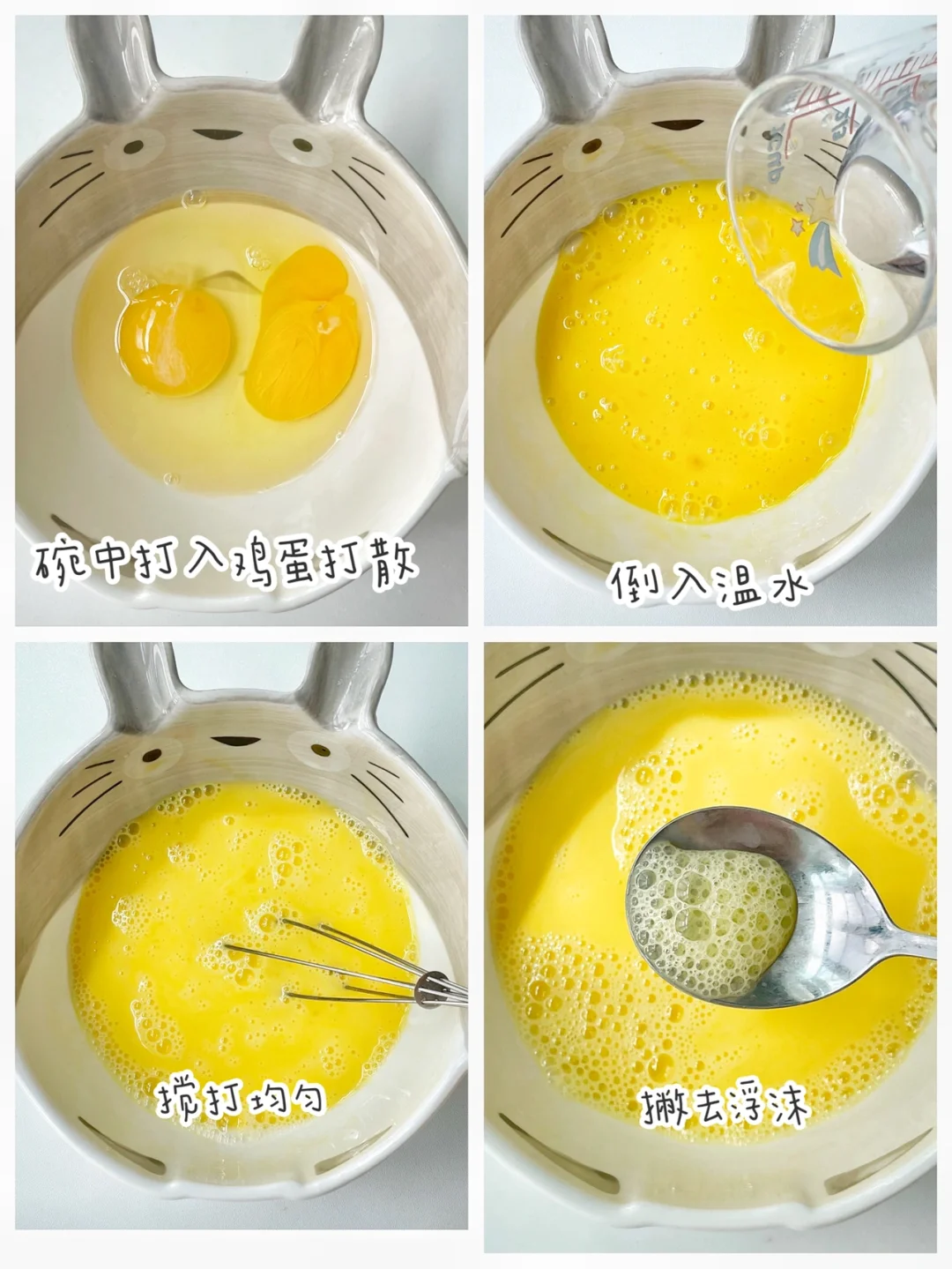 🔹碗里打入2个鸡蛋打散,倒入温水搅匀,用勺子撇去浮沫,
