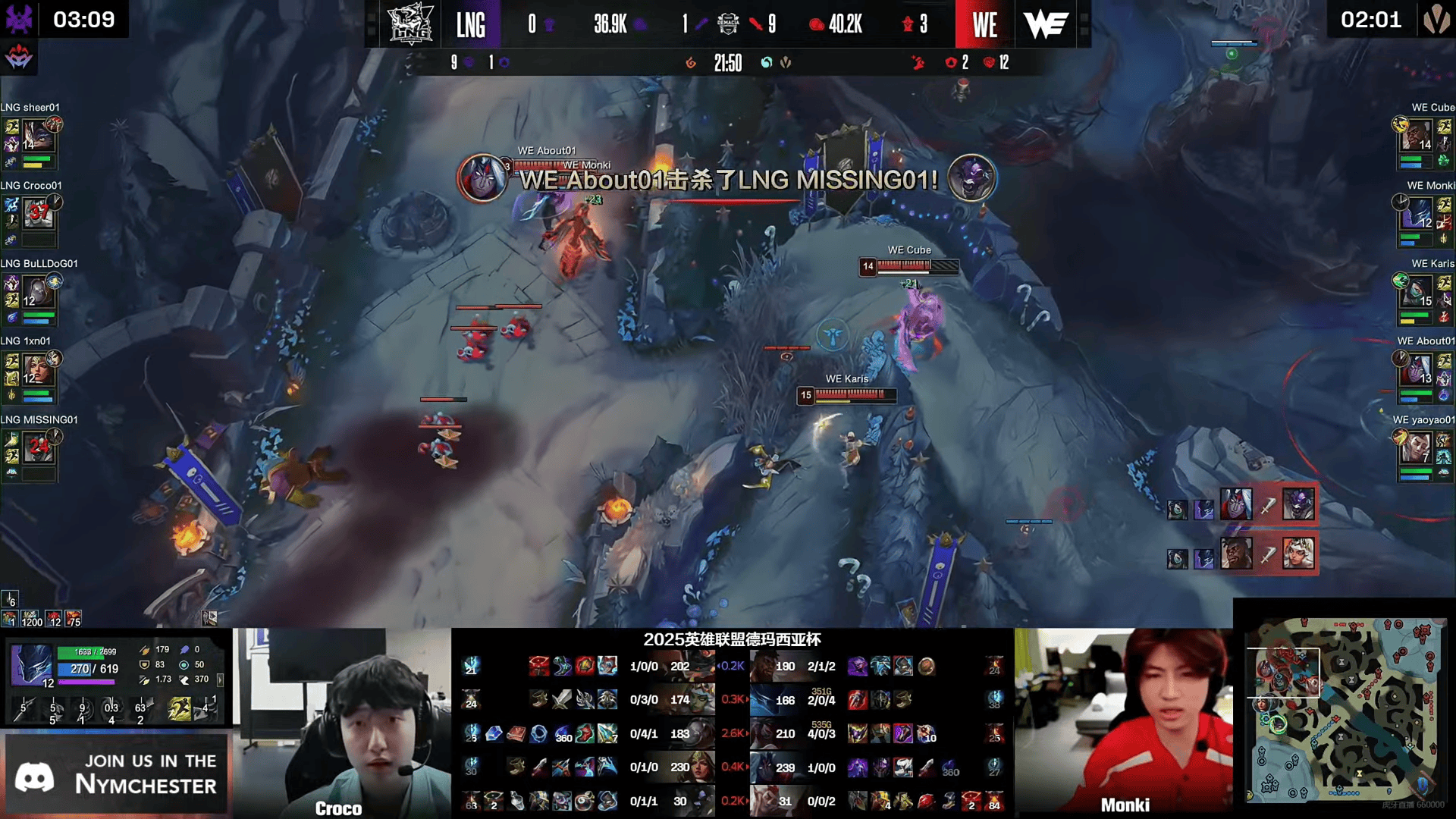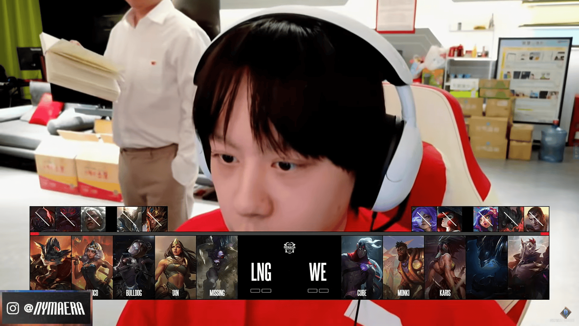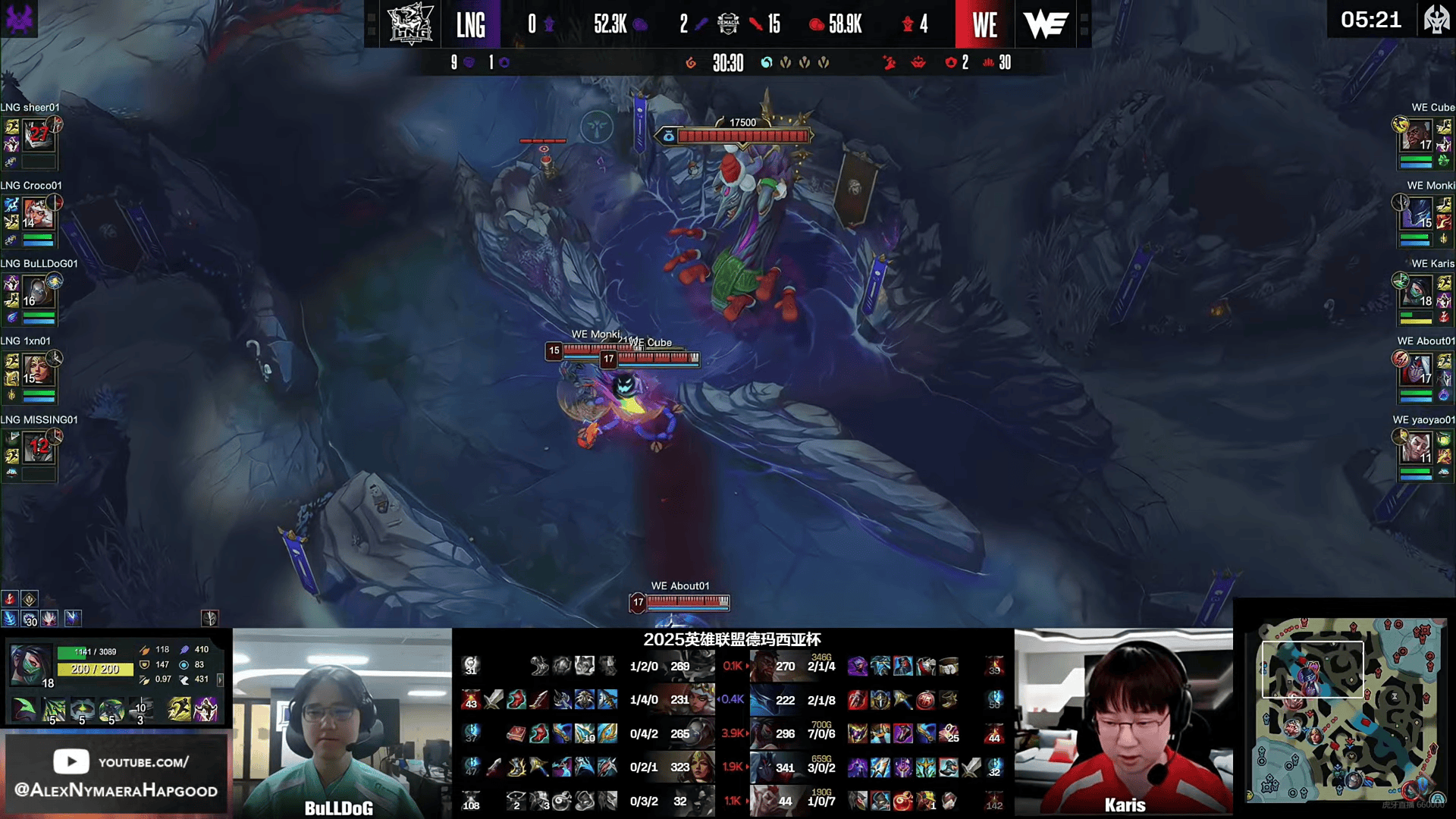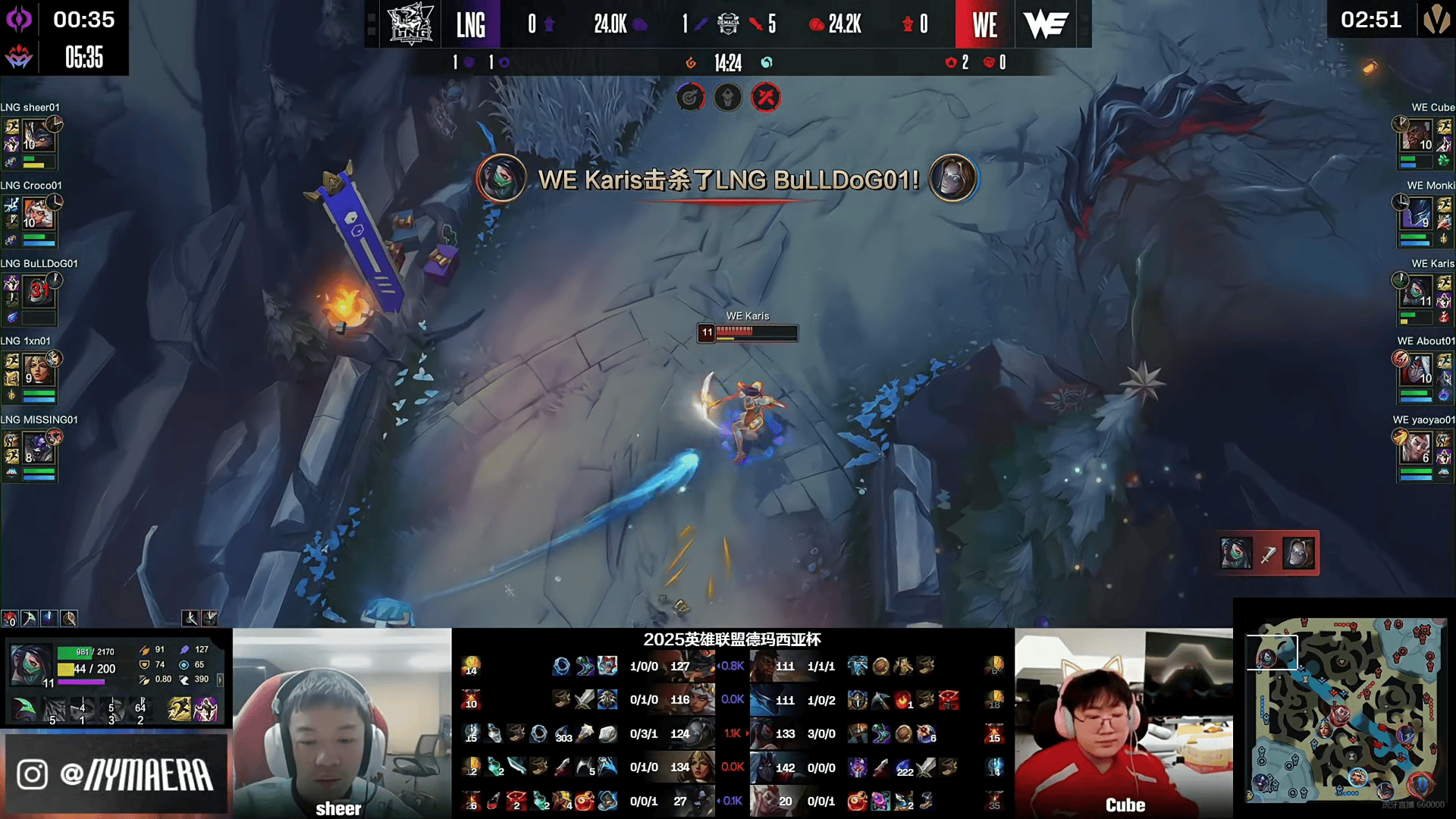 比赛前期Karis阿卡丽多次单杀BuLLDoG发条帮助WE前期打出优势。