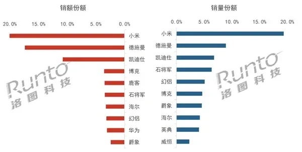 2023年Q1线上智能门锁销额和销量出炉,小米市场份额达到了19.4%,销售额达到21.3%,遥遥领先第二名,甚至前几名销量加起来也没小米多。