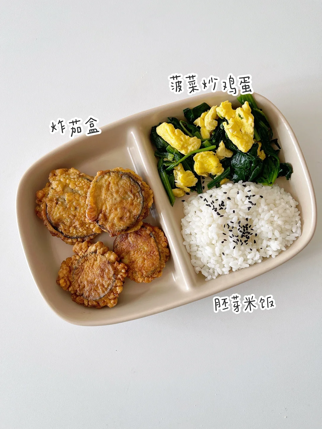 ✅周六:炸茄盒、菠菜炒蛋、胚芽米饭
