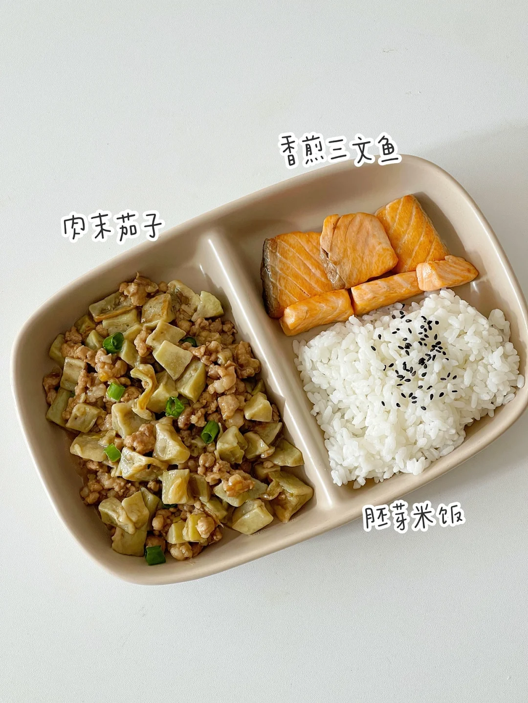 ✅周五:肉末茄子、香煎三文鱼、米饭