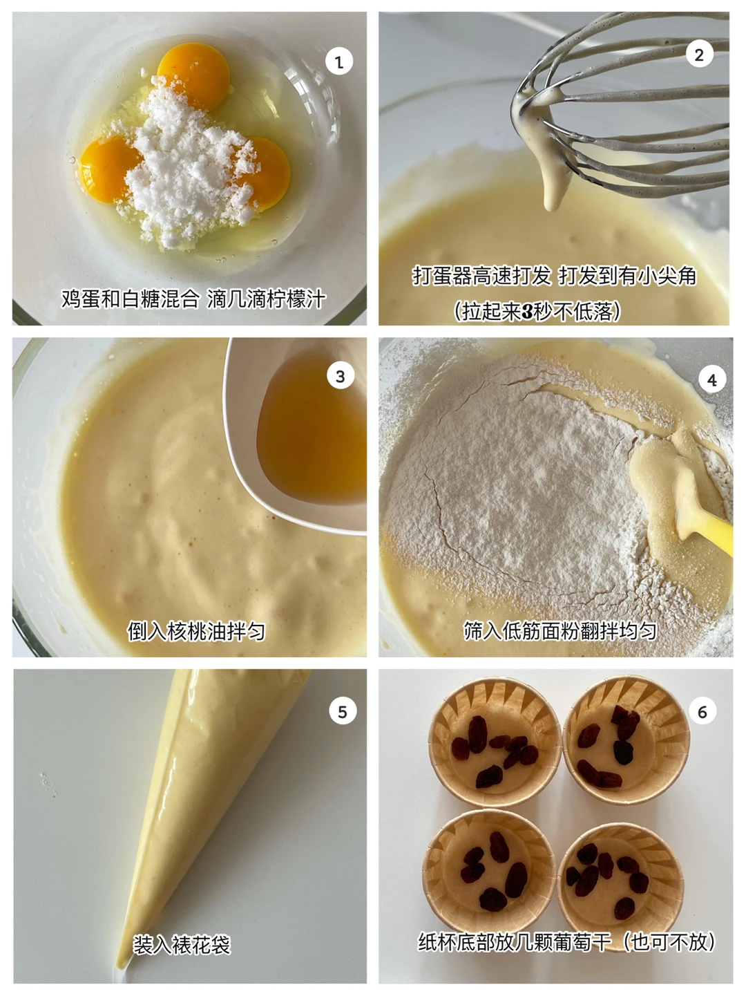 ❤️蛋糕准备材料:鸡蛋3个,糖20克,柠檬汁、核桃油15克,低粉60克,适量葡萄干。