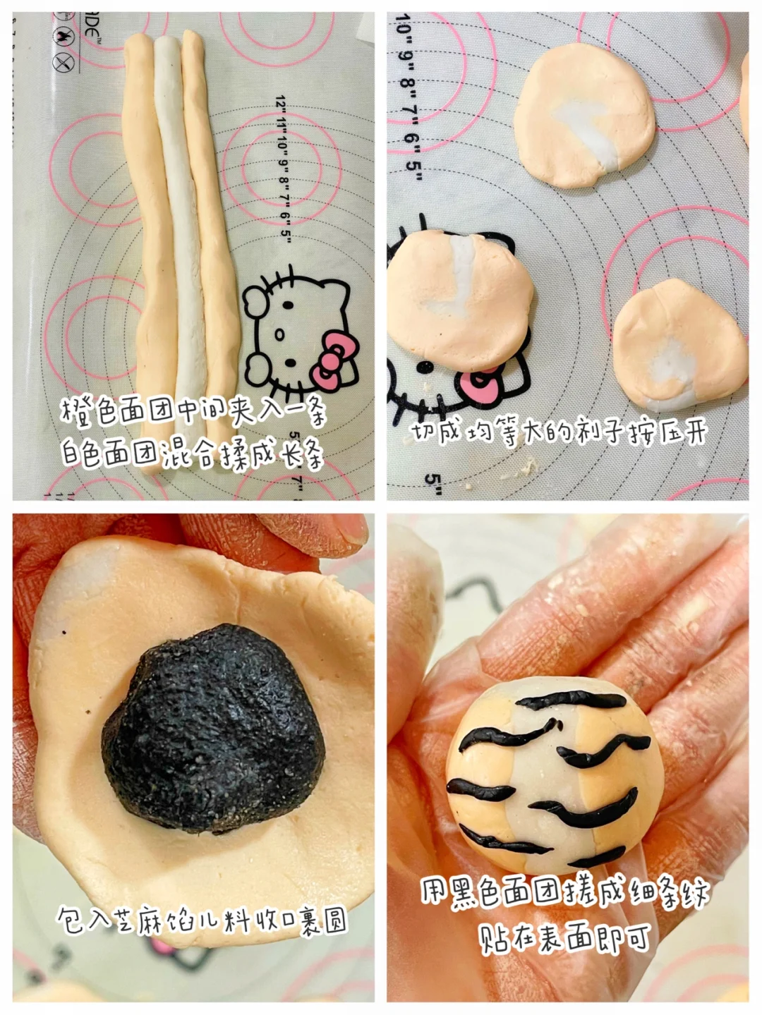 🔹橙色面团揉成两条细长条,中间夹一条白色的,混合揉成一整条,切成均等大小的剂子.按压开中间包上黑芝麻馅儿,收口裹圆,黑色面团搓成细条纹,黏贴在表面即可.