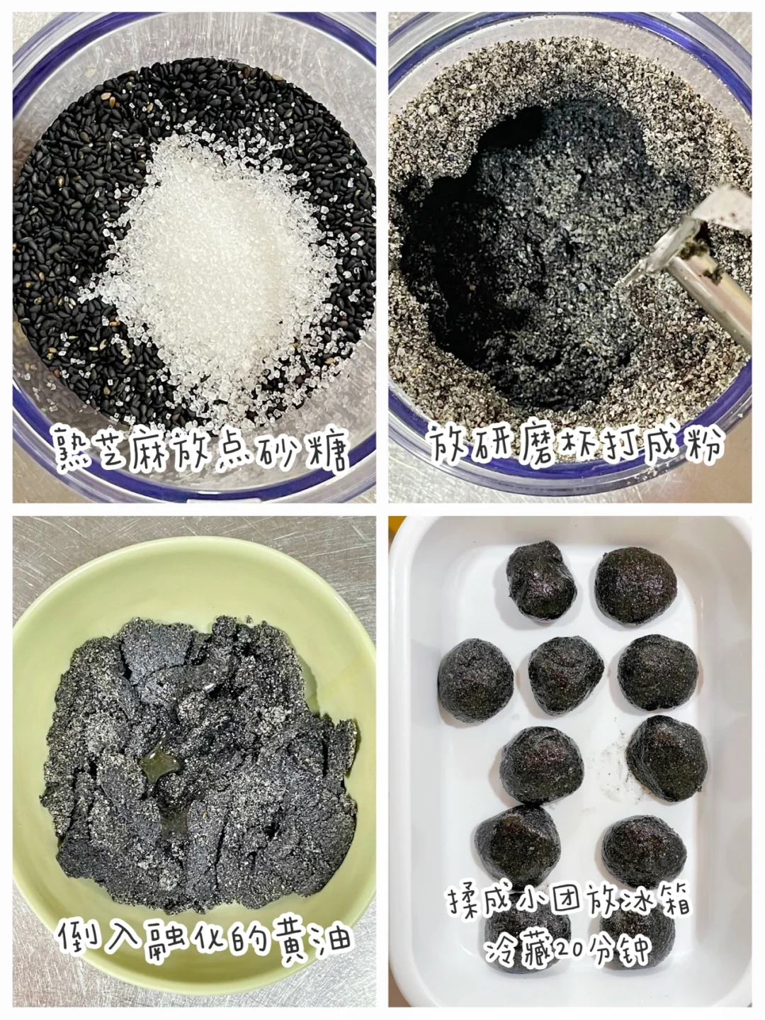 🔹制作方法:熟芝麻加适量的白砂糖用研磨杯打成粉,用融化的黄油拌匀,揉成9克左右大小的芝麻团,放冰箱冷藏20分钟,馅儿料就做好了.