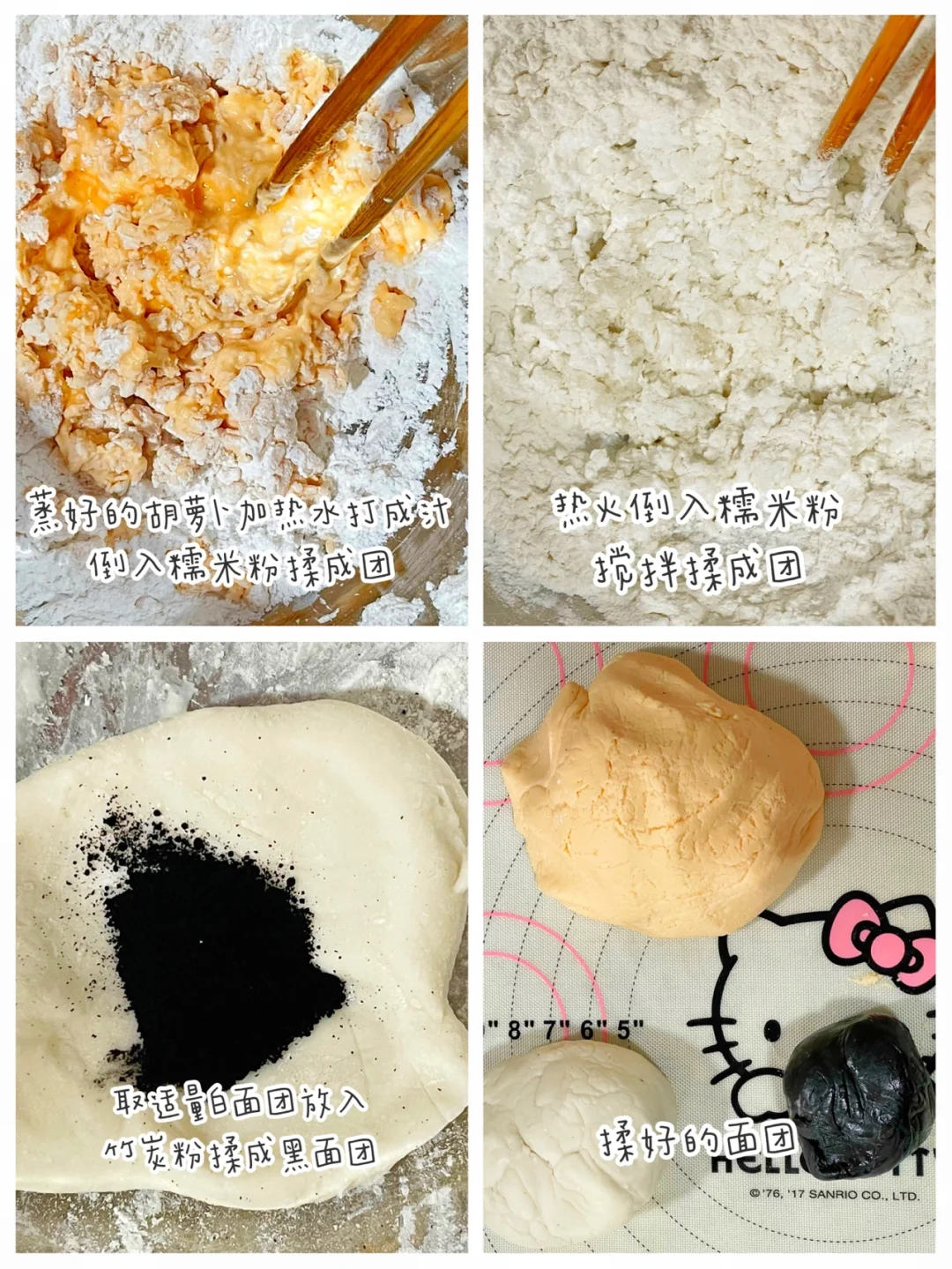 🔹制作方法:胡萝卜蒸熟,加适量热水打成胡萝卜汁,放入糯米粉揉成橘色的面团.